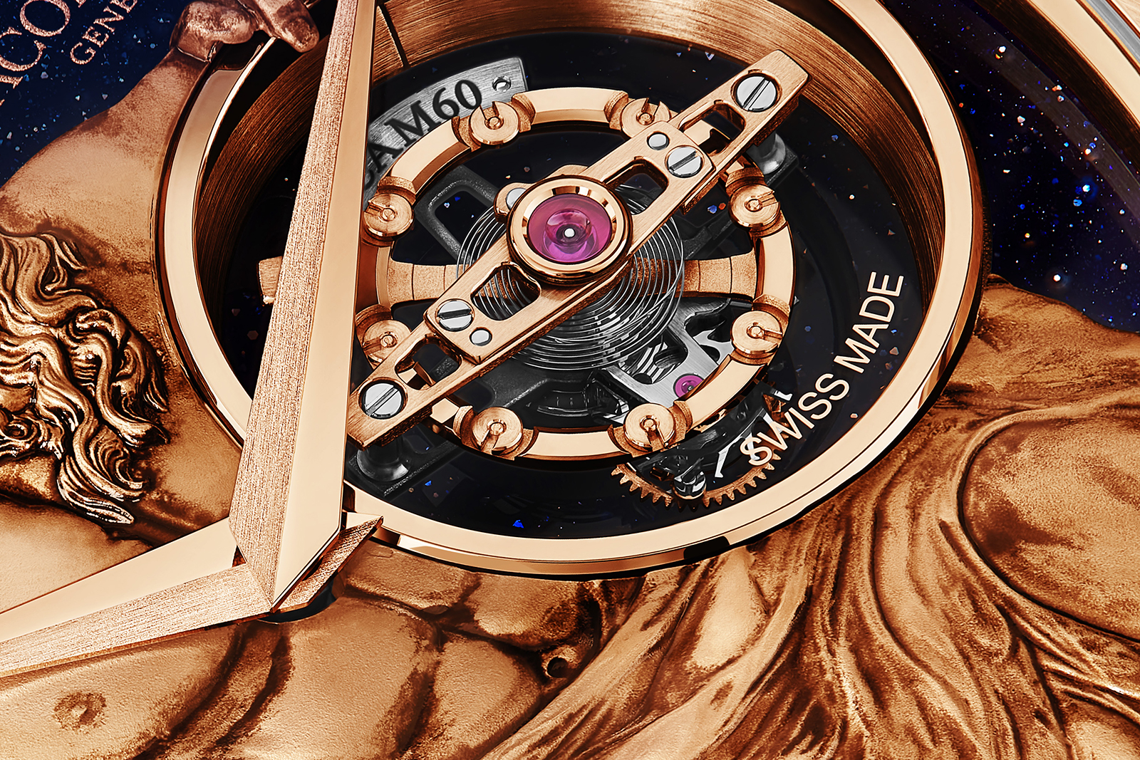 While Jacob & Co. does not share much detail on the architecture of the JCAM60 movement inside the God of Time, the calibre construction can be inferred from visible parts. In a conventional tourbillon with a 3 Hz balance and 15 teeth escape wheel, the ratio from the fourth wheel to the escape pinion is 12:1. Here it looks like the ratio is 4:5, since the escape wheel actually turns slower than the cage itself. The entire cage only weights 0.27 g.