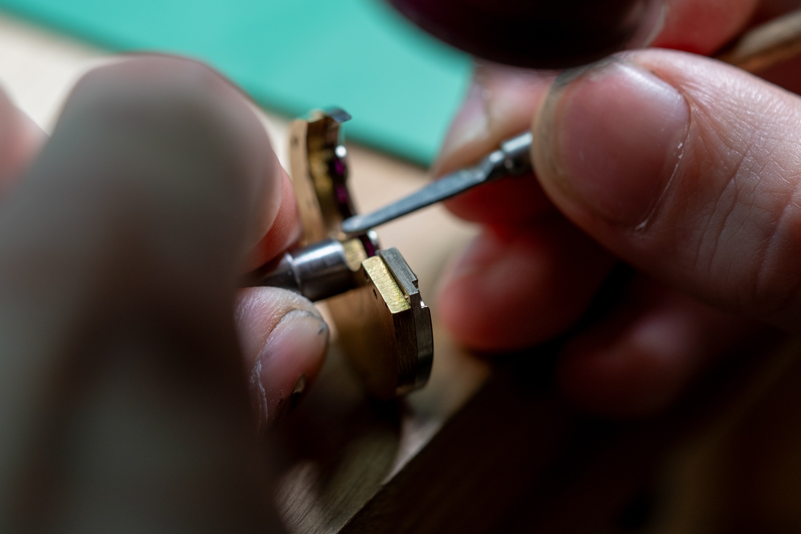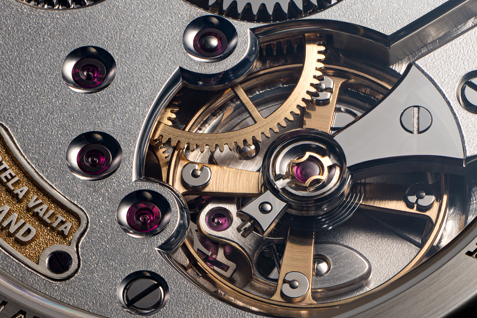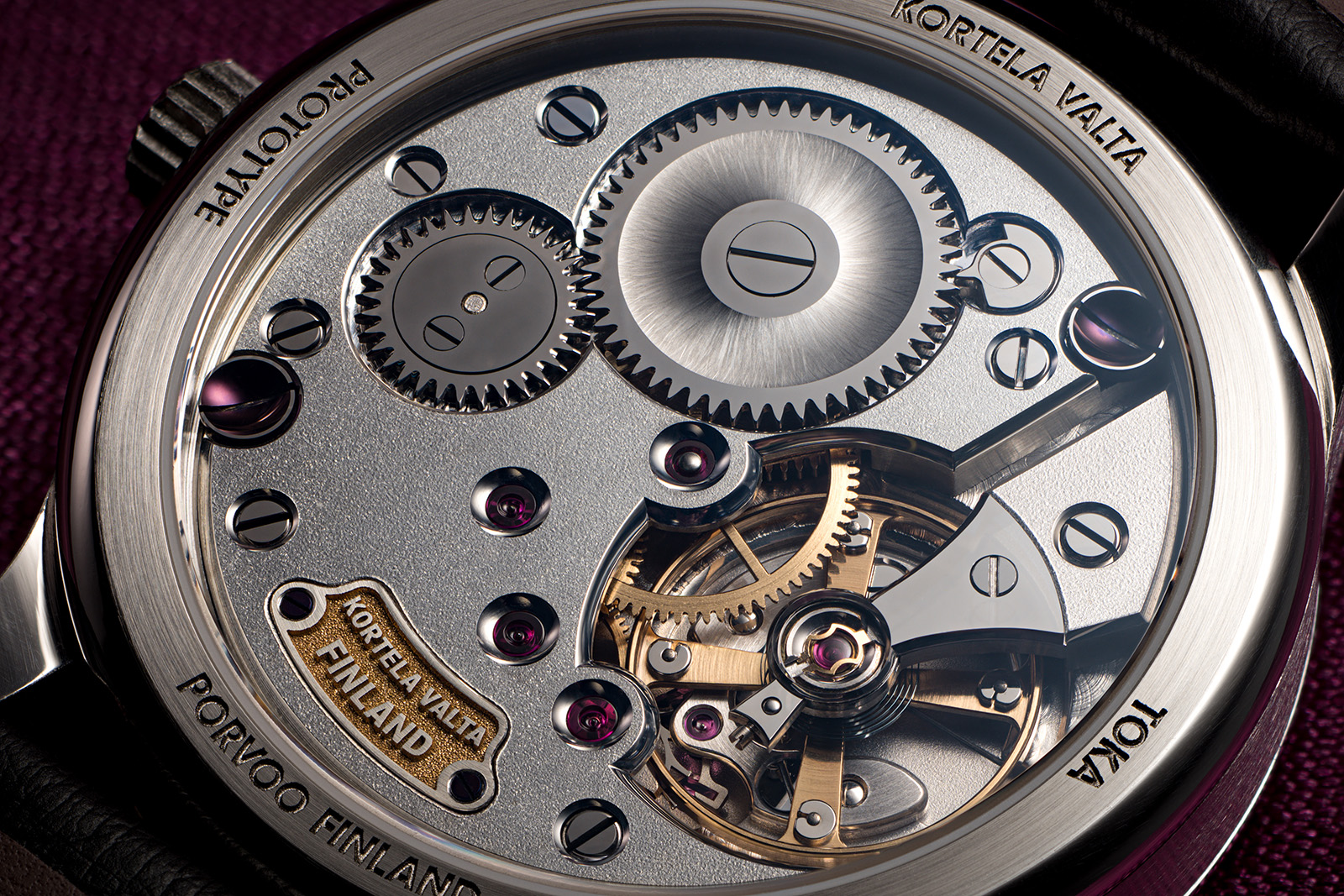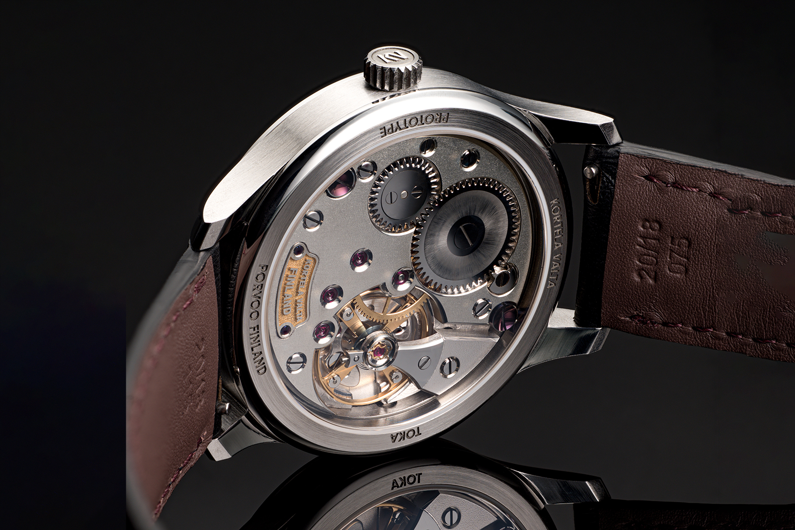 There is also a small recessed name plate, which proudly denotes the country of origin in relief against a gold-plated backdrop. The train wheels are also gold-plated in-house, along with the balance wheel itself. Plating and electroplating are processes usually outsourced to Swiss specialists, but Kortela Valta does all plating in its own workshop.
