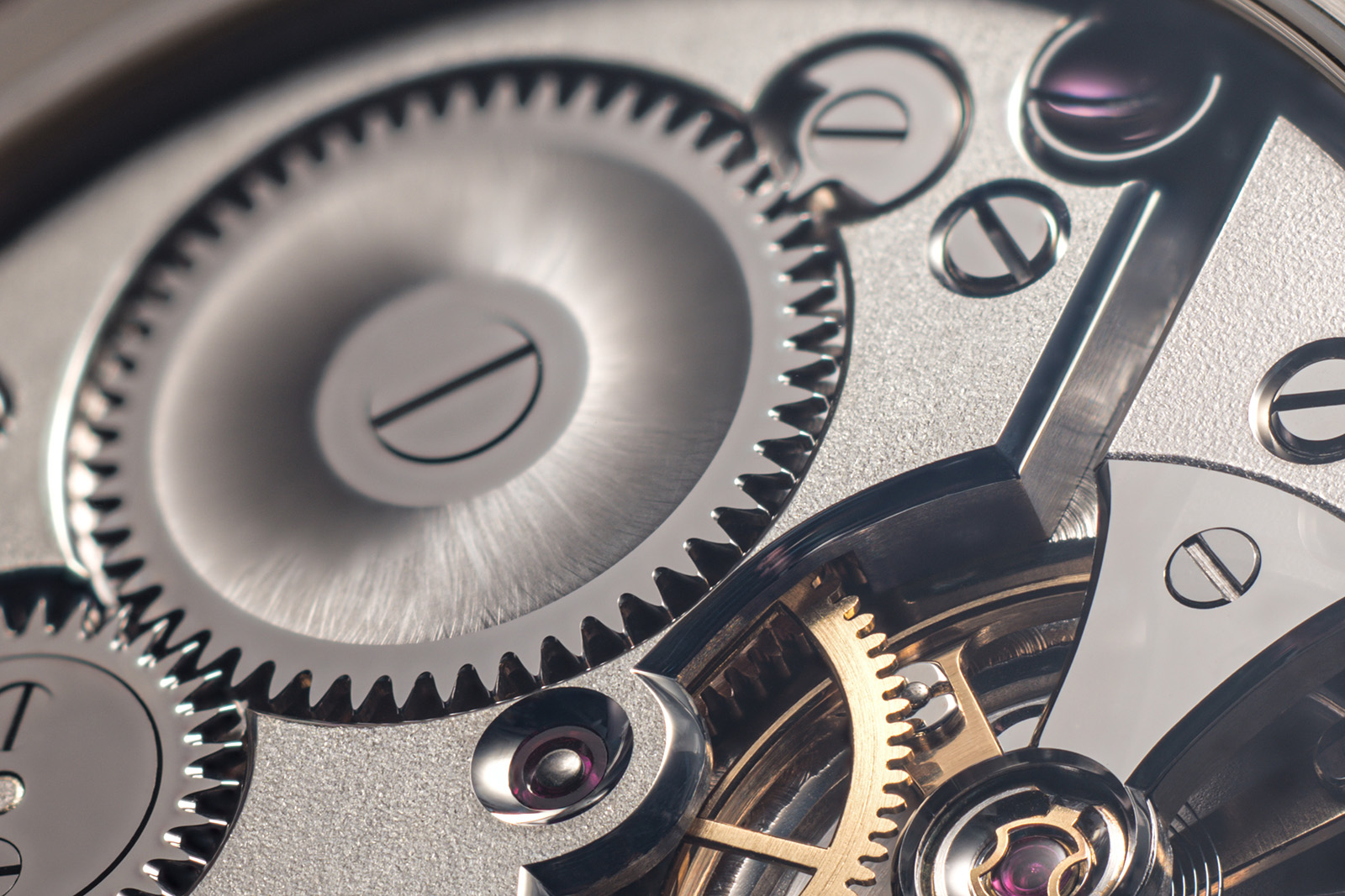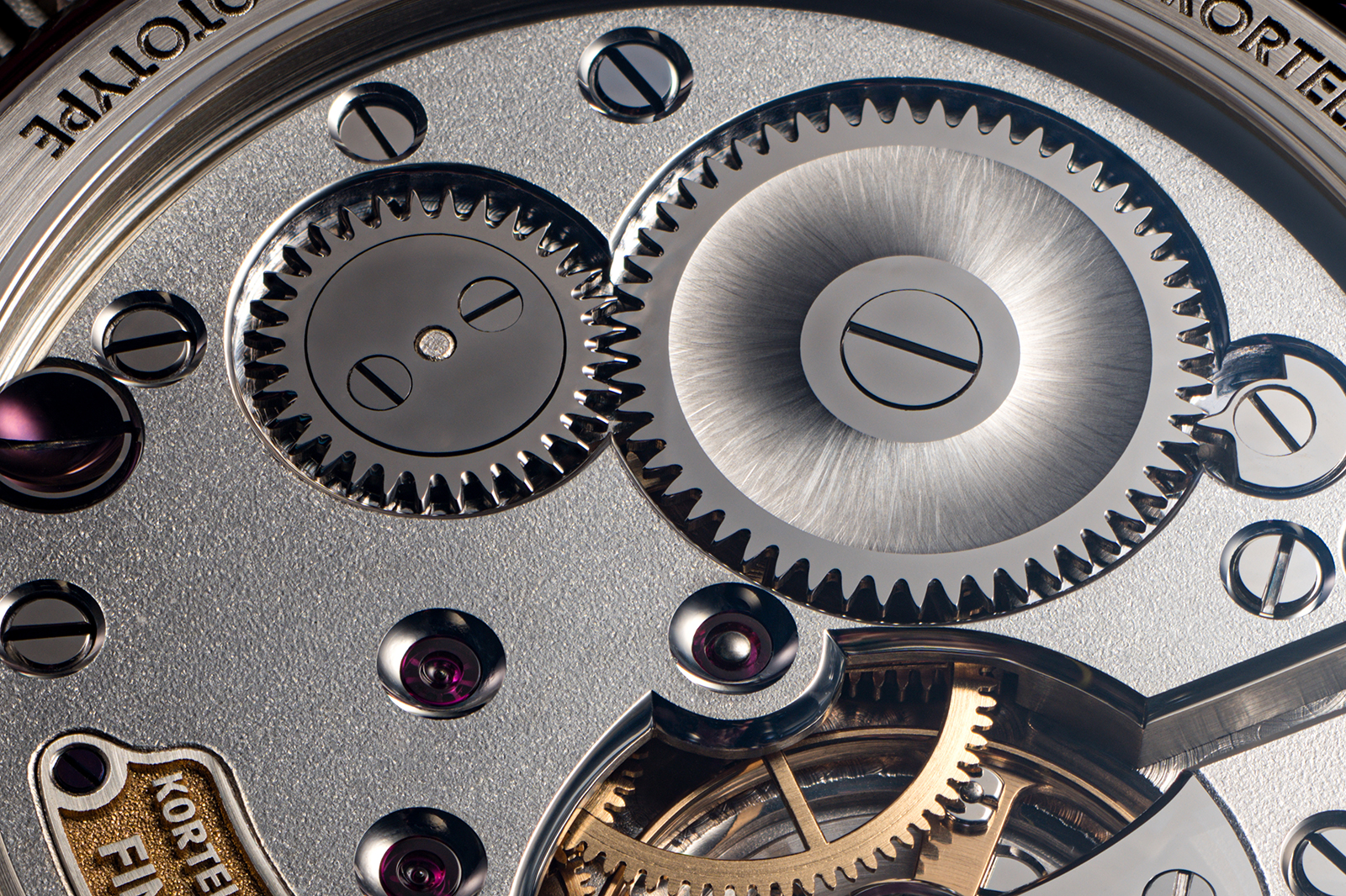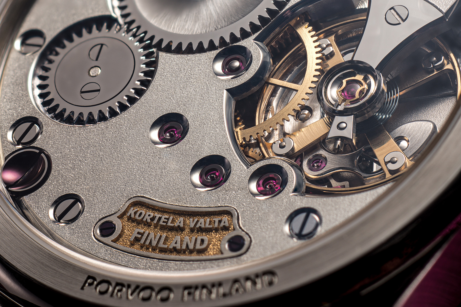 Messrs Kortela and Valta evidently put a great deal of effort into the finishing, which exhibits a degree of uniformity often missing from small-scale artisanal work. The polished counter sinks for the jewels are wide and consistent, and the graining on the plates is soft and even. The faceted screw heads and black-polished steelwork contribute to the (mostly) monochromatic palette and provide a sense of comfortable uniformity.