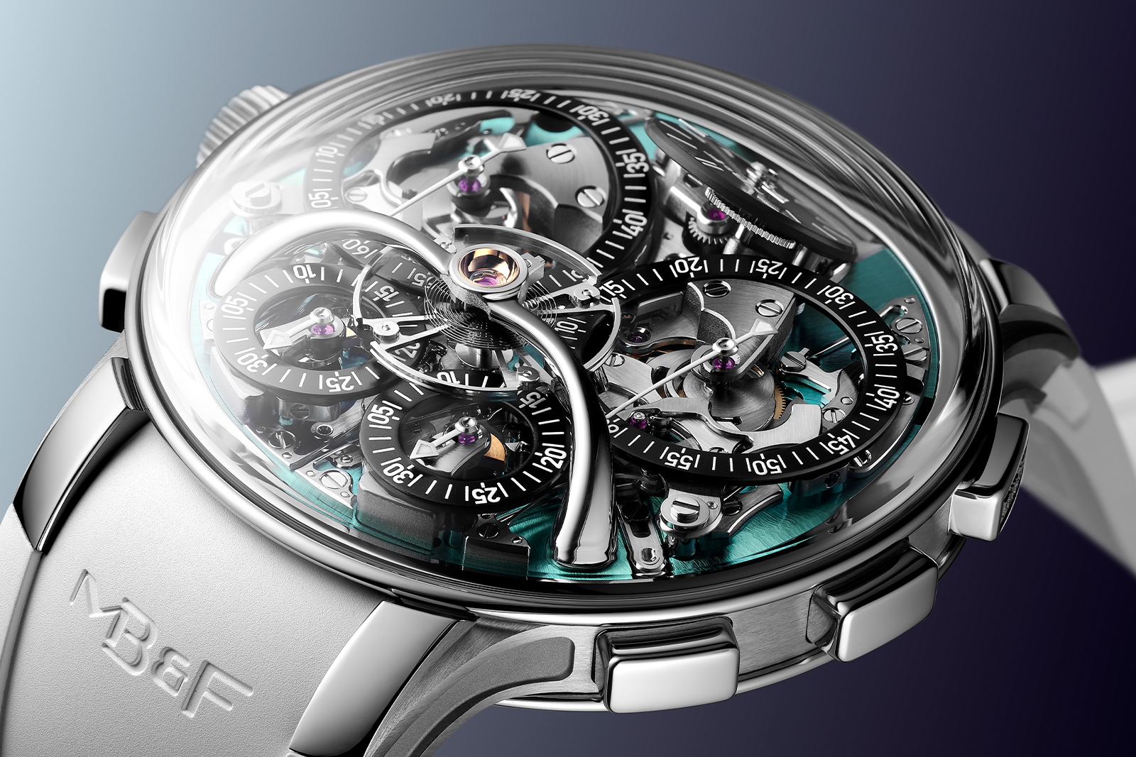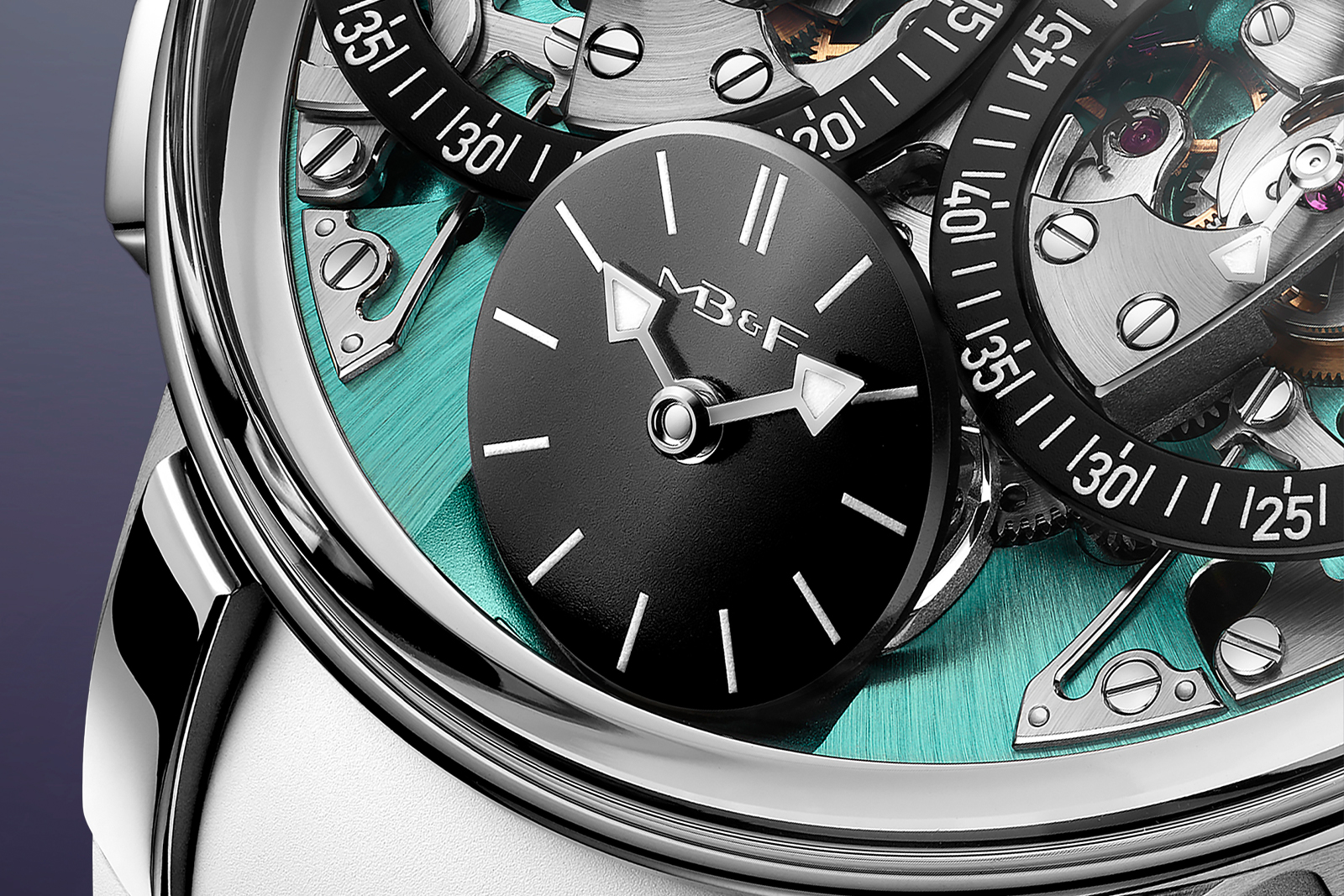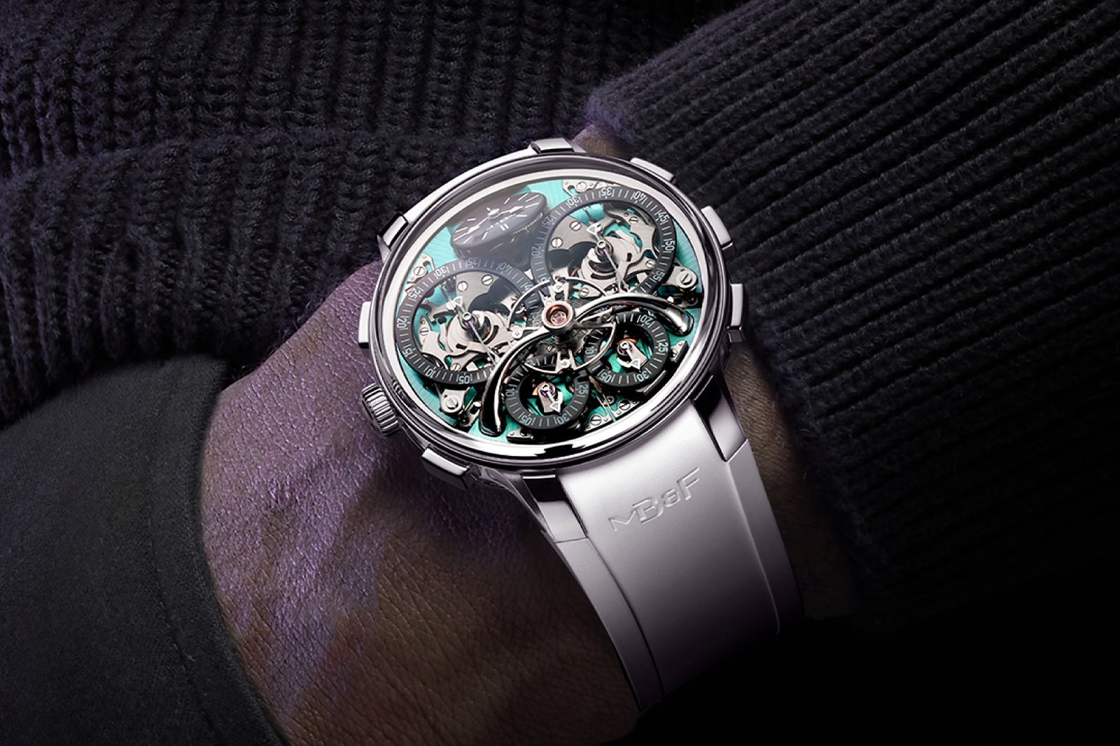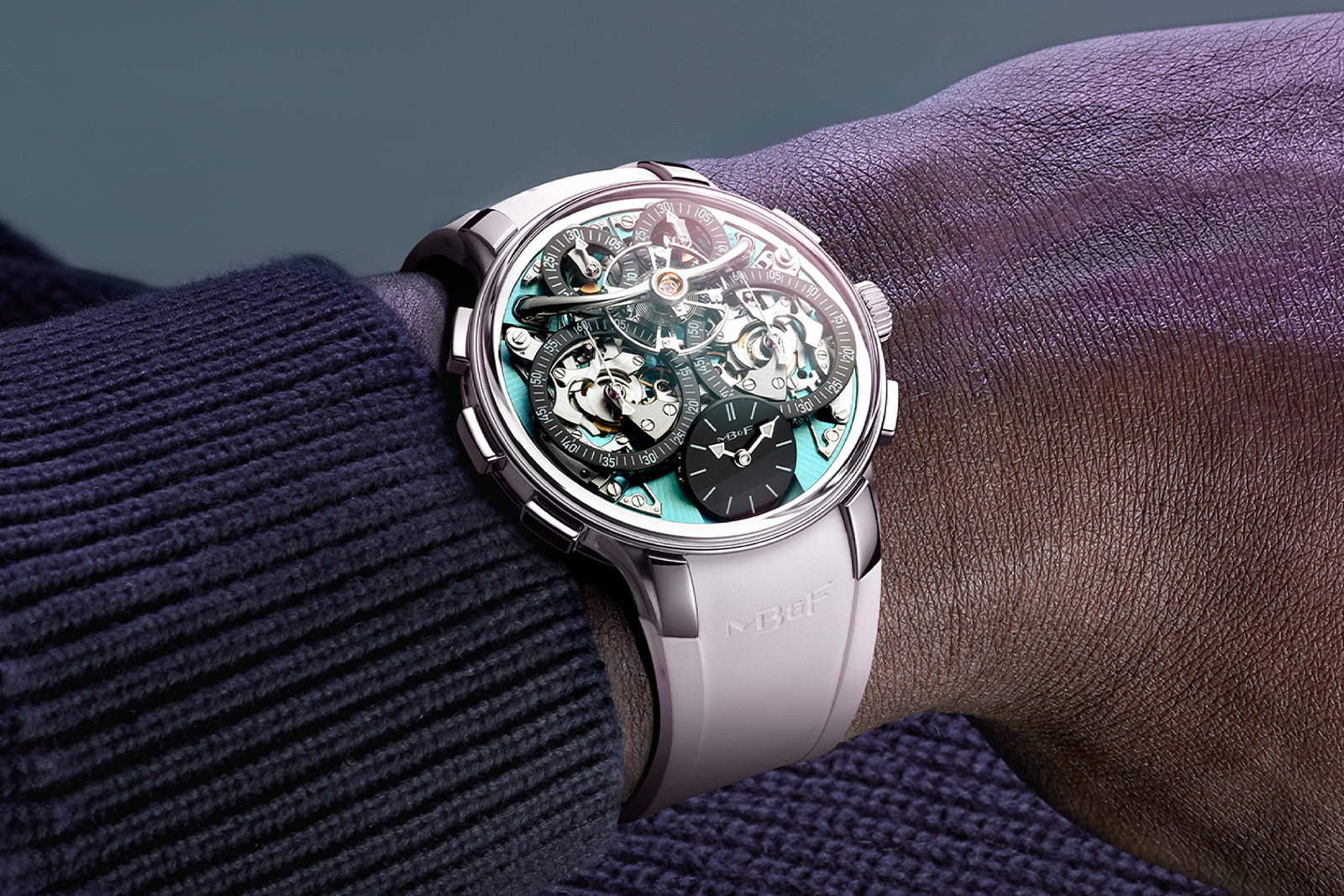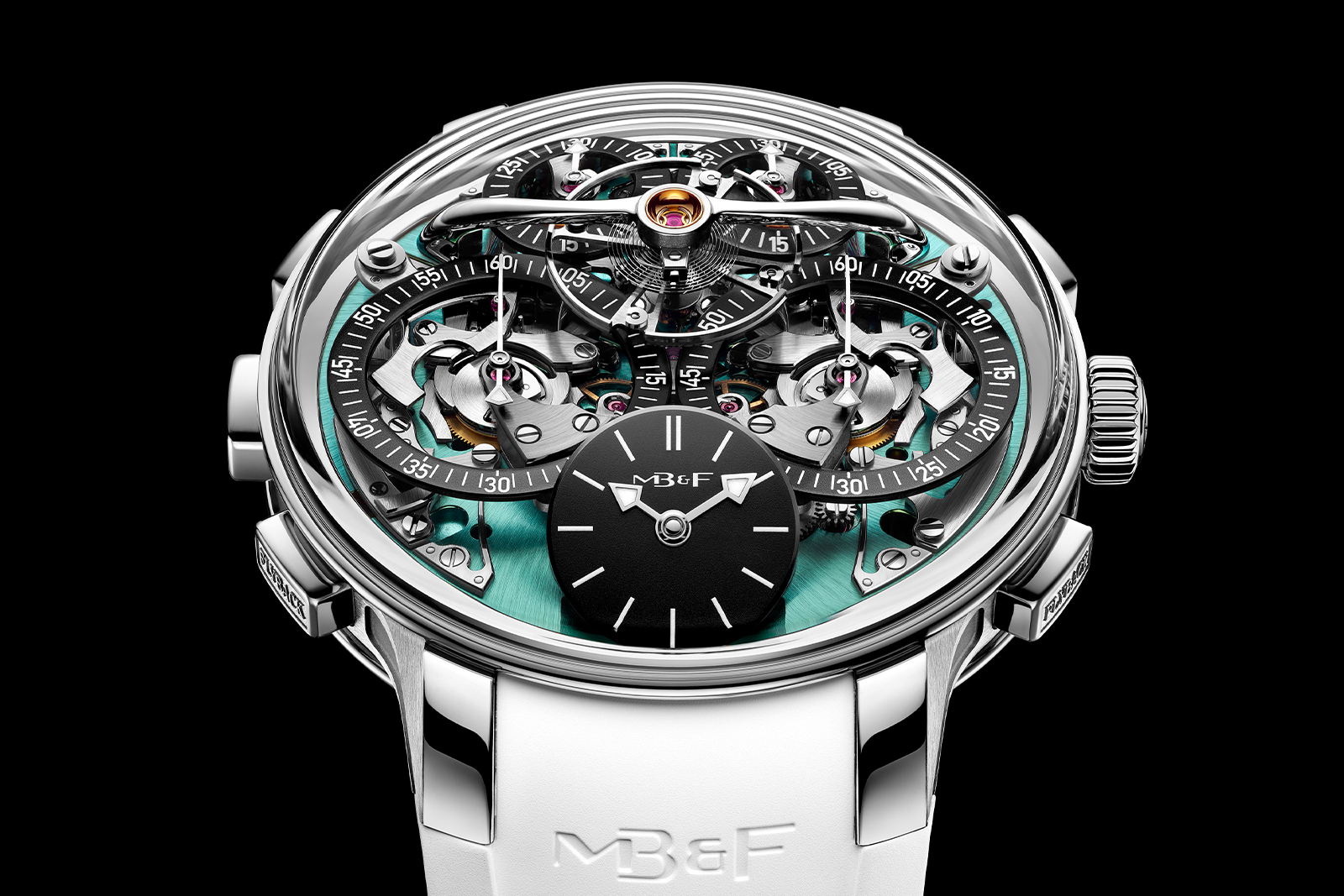 MB&F has updated its EVO line with an aquamarine version of Stephen McDonnell’s ingenious double chronograph, freshly upgraded with the flyback functionality first seen in the classic Legacy Machine Sequential. The Legacy Machine Sequential Flyback EVO is a tough titanium timer suited to the rigours of daily wear thanks to its shock-protected and water resistant case and supple rubber strap.