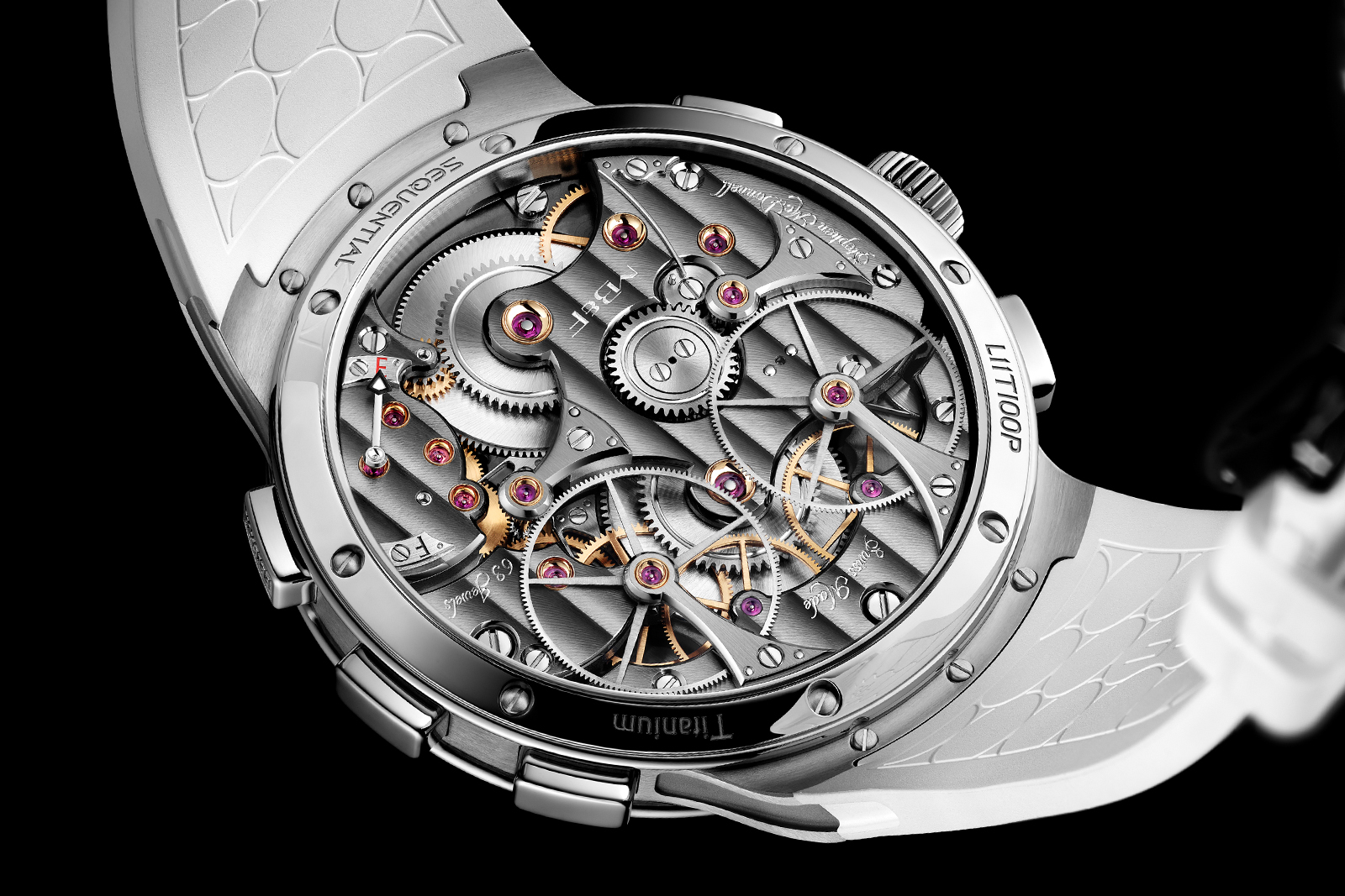 This latest iteration applies the movement’s latest upgrades, principally the flyback function, to a sporty, titanium, Legacy Machine EVO case, which comes with enhanced shock and water resistance. Despite these tangible upgrades, the EVO Sequential is no larger than its dressier precious metal Legacy Machine counterparts. That’s a good thing, since the watch has a commanding, almost overwhelming presence on the wrist as it is.