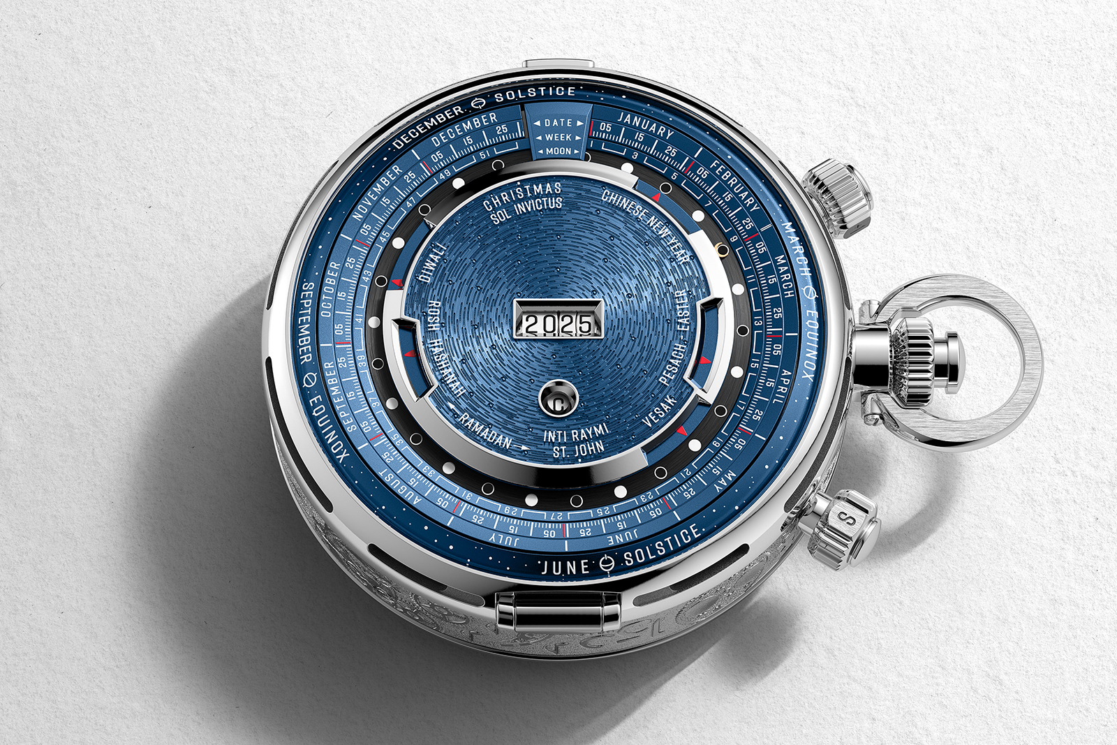 The intricate system is housed inside the case back and allows the user to effortlessly cycle through dates across any year to be able to read a surprising number of culturally-relevant dates based on lunar, solar and lunisolar cycles.