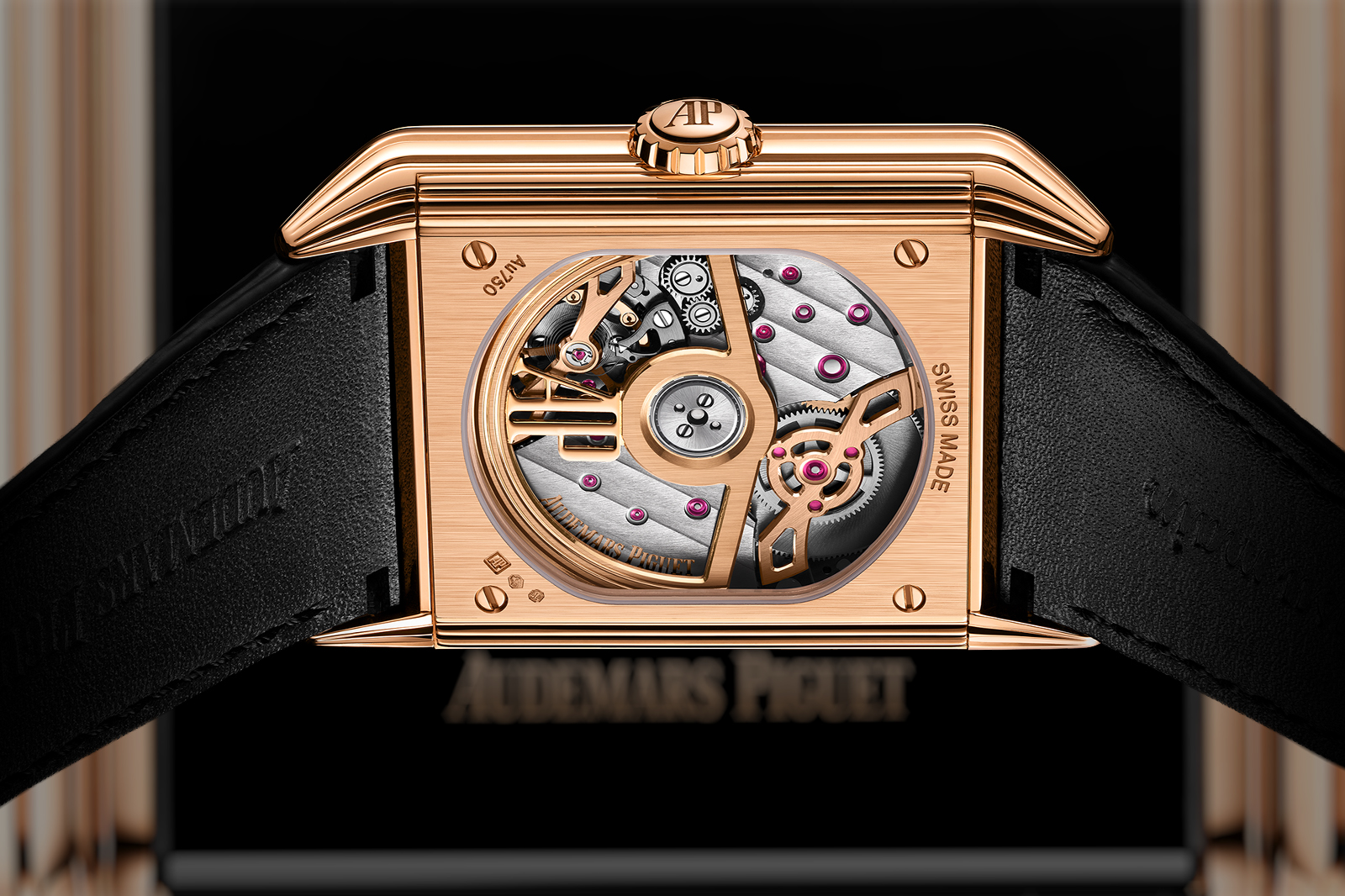 Interestingly, the sapphire crystal is not framed at the 6 and 12 o’clock positions, adding a futuristic edge-to-edge look to an otherwise classic design. The case hugs the crystal on each side with slender gadroon-like lines running from lug to lug. The specific design resembles historic guichet Audemars Piguet watches and is also a nod to the lavishness of the Art Deco period.