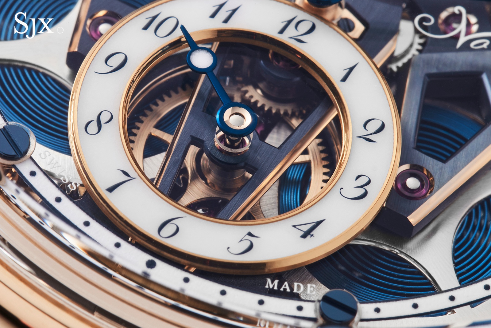 Of course, the star of the show is the smoothly gliding tourbillon cage at 12 o’clock. Thanks to the 10 Hz frequency of the balance, the rotation of the cage, and its attached seconds hand, is nearly as stutter-free as the seconds hand of a Spring Drive calibre, an effect never-before-seen in a tourbillon format. In fact, the discreet steps of the intermediate wheel that powers the escape wheel are almost imperceptible, giving it a look similar to a Spring Drive calibre’s glide wheel.