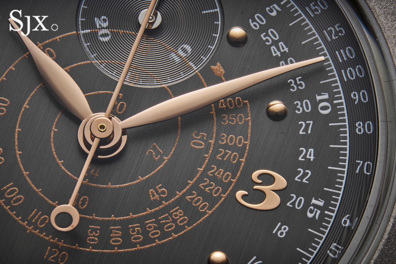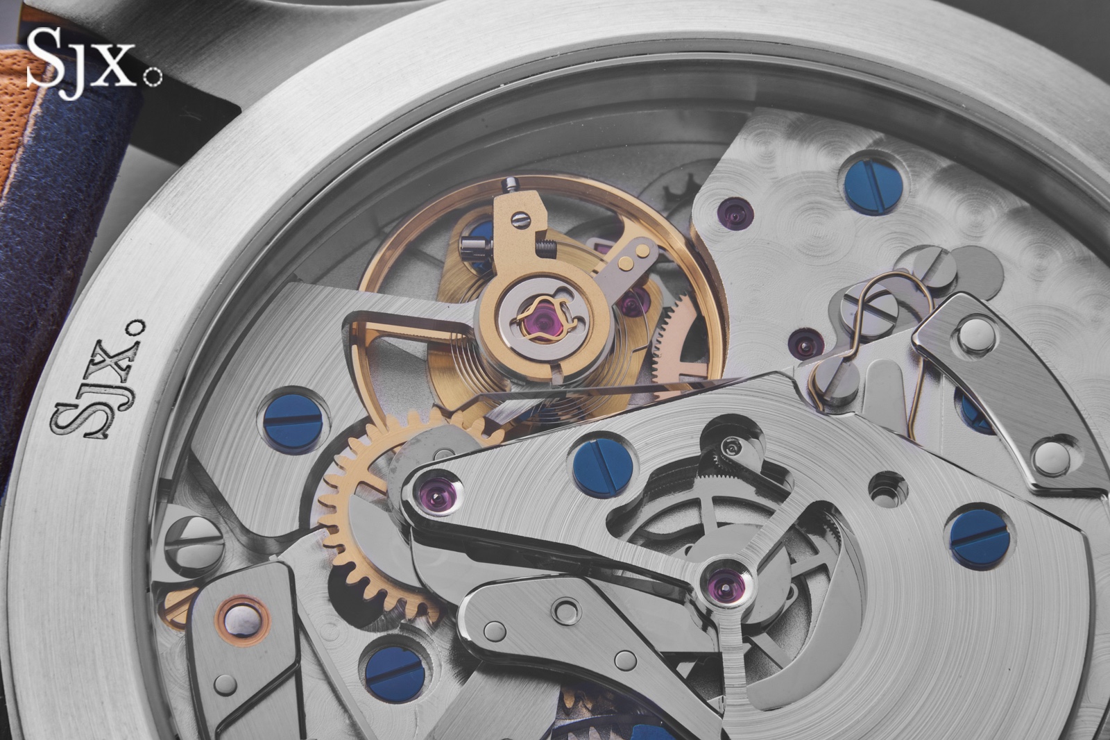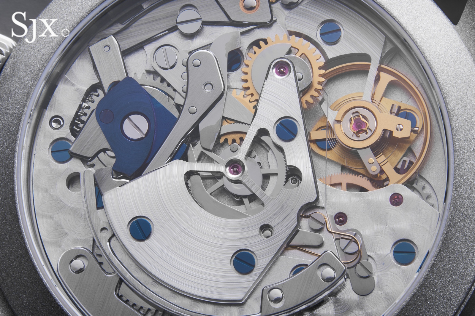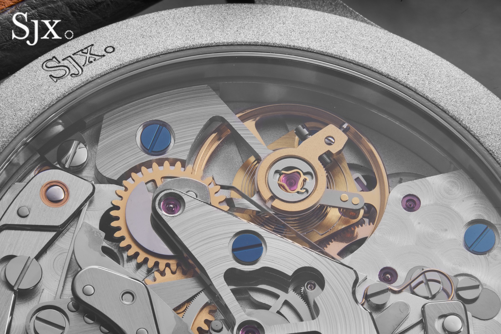 “Building on the basic idea of vintage-but-different, I decided on two colour combinations for the watch” says SJX. “One is a blasted steel case with a grey dial and rose gold accents; a little evocative of nickel-plated cases and gilt dials. And the other is a classic silver-and-blue that brings out the textures on the dial.”