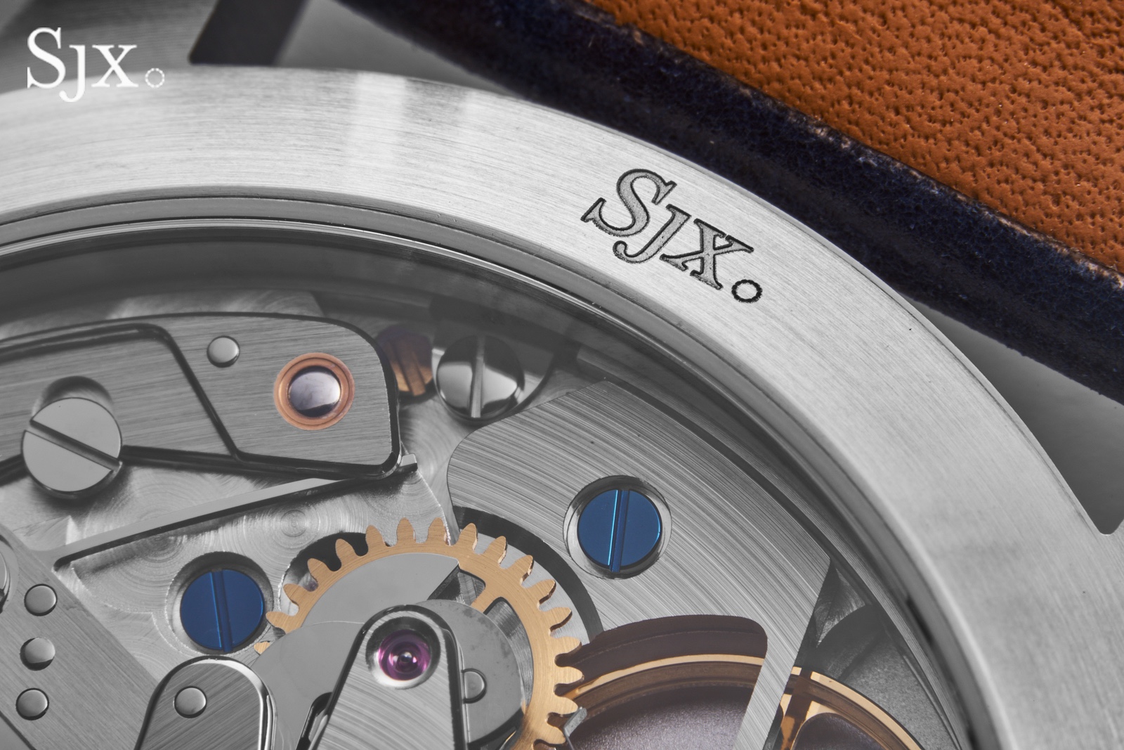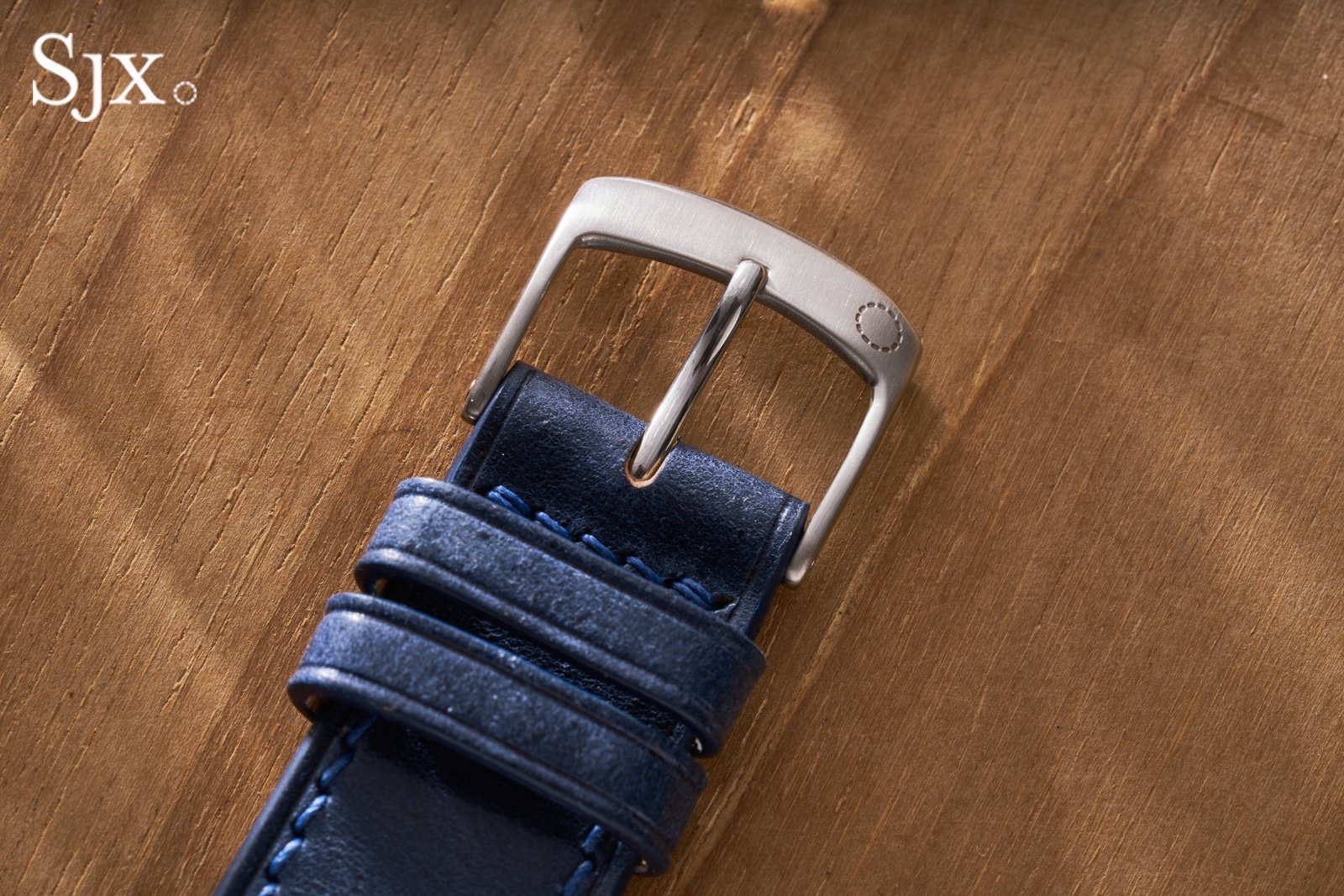 Here, that wabi-sabi aesthetic is reinterpreted in solid stainless steel with modern precision, giving the surface a tactile richness and uniformity worthy of a contemporary high-end watch. The case finish is replicated on the simple buckle, which is engraved with the SJX logo.