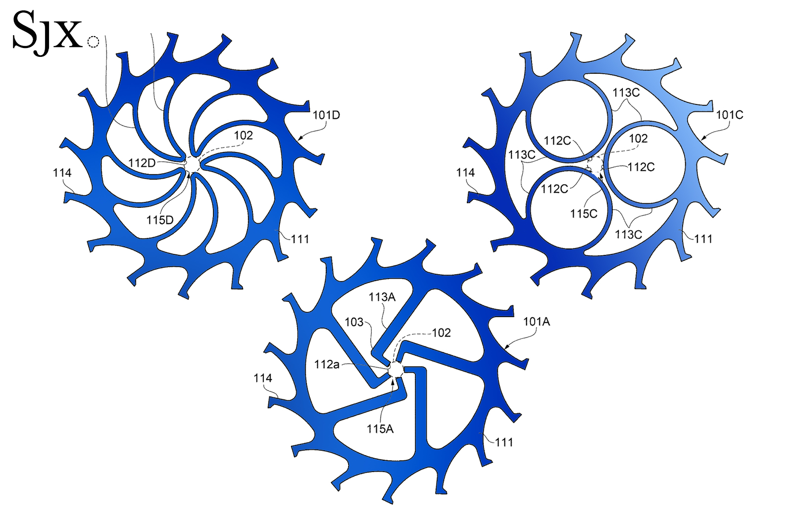 Several other escape wheel designs that seemingly didn’t make the cut. Image – JP6772790B2, edited and coloured by the author.
