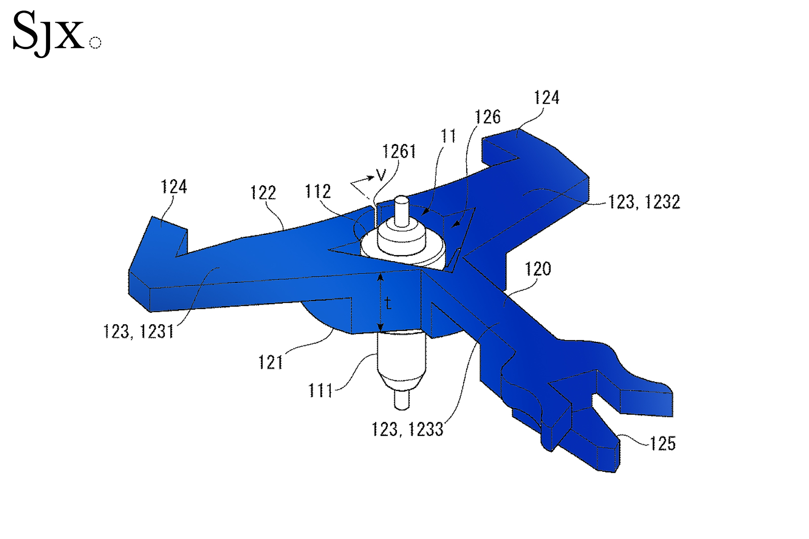 Another as-yet unseen component can be found in patents – a silicon pallet fork. Rather than using an adhesive or press-fit, the pallet fork grips its axis, like the arms of the escape wheel. Perhaps more notably, it combines what is normally a four-part assembly (the pallet fork, two jewels, and the safety dart) into a single piece. This part would require a second round of masking and etching, making it slightly more complicated to produce than the silicon escape wheels.
