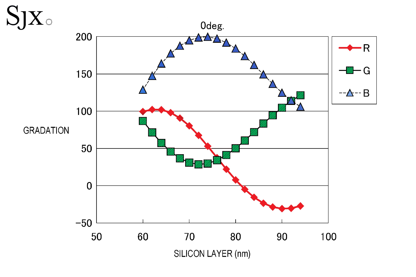 The intermediate poly-crystalline silicon layer, on the other hand, is purely aesthetic. As with the oxide layer that gives blued steel components their hue, the thickness of each poly-crystalline silicon layer determines which wavelengths of light transmit back to the observer. Based on the brilliant blue colour, the film is presumably between 75 and 80 nanometres thick.