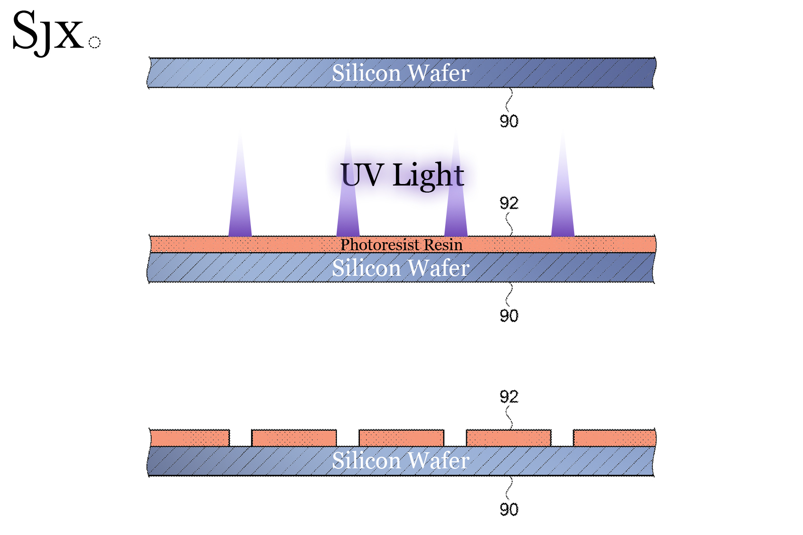 The UV light affects the solubility of the polymer, making it more soluble in the case of positive photoresist or less soluble in the case of a negative photoresist. Either way, the more soluble regions of the photoresist resin are dissolved in a solvent, leaving a trench of exposed silicon wafer around the escape wheels, and between the spokes.
