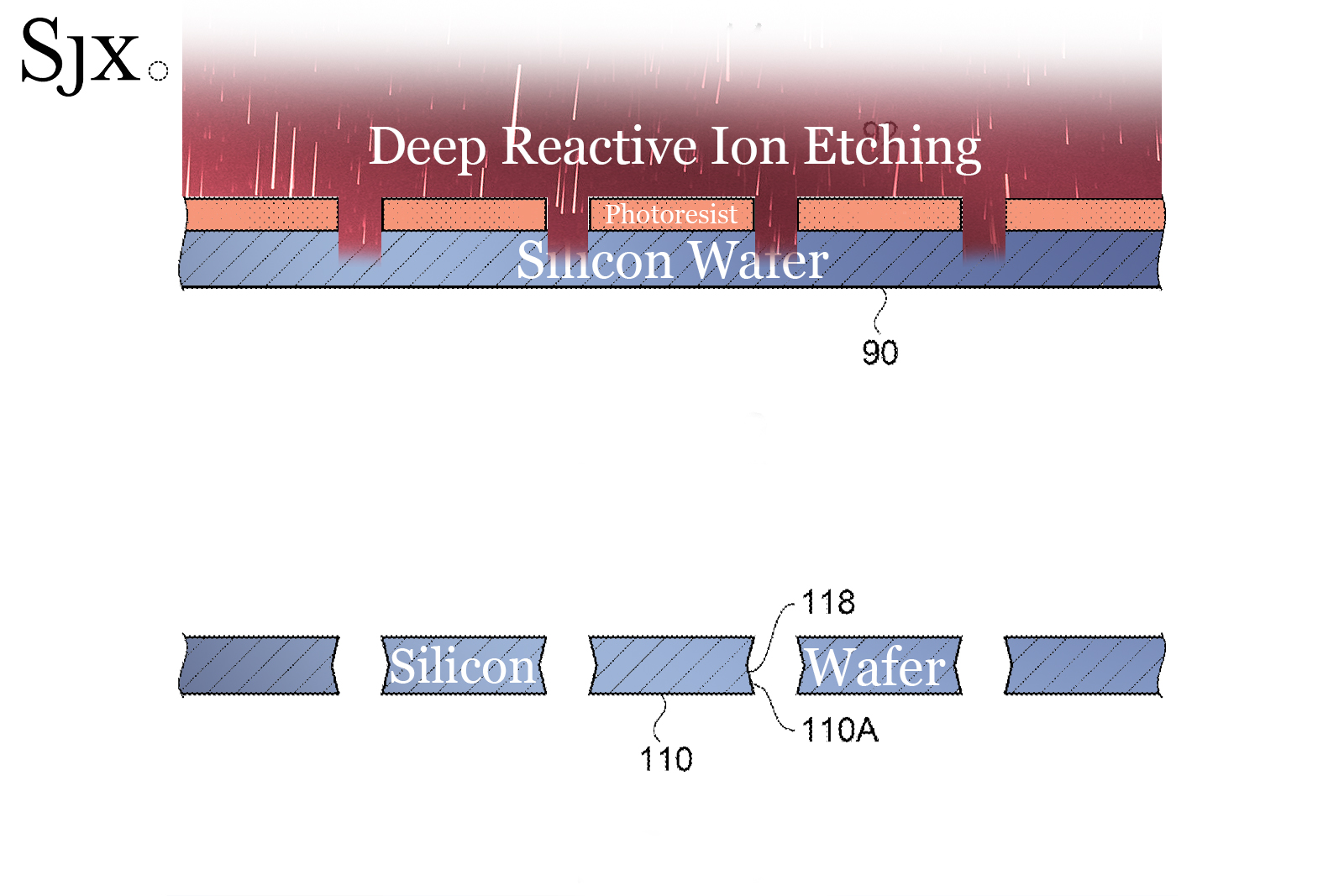 The wafer is then subjected to Deep Reactive Ion Etching (DRIE) which destroys regions of the wafer that aren’t shielded by the photoresist resin. Another, stronger solvent is used to remove the remaining photoresist, which leaves a hundreds of escape wheels just barely connected to the wafer.