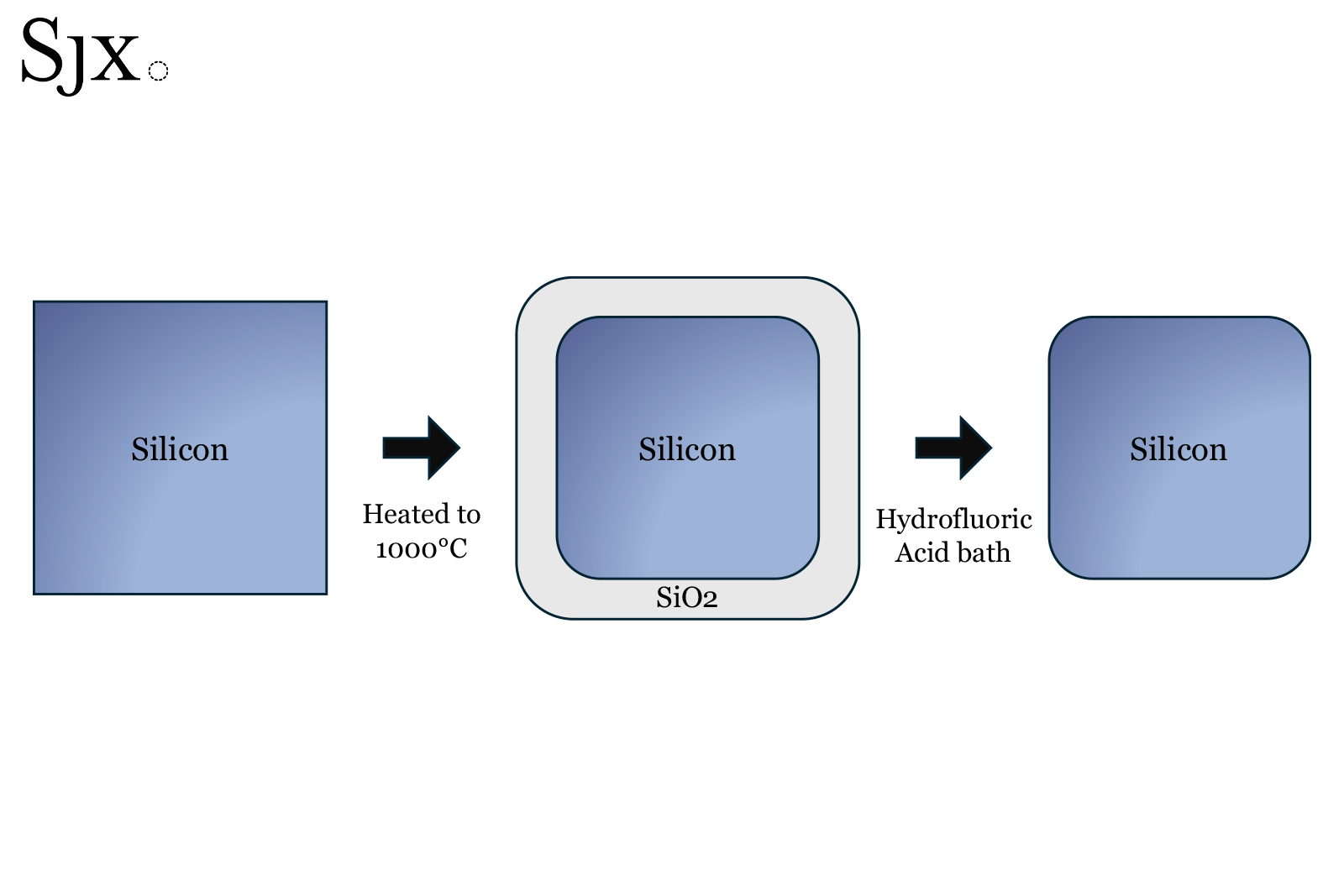 At this stage, the monocrystalline silicon escape wheels are too fragile for use in watches, so they are heated to 1000°C in an oxygen-rich environment to form a silicon oxide (SiO2) layer which greatly increases the size of the escape wheels while also creating a smooth surface and rounding out sharp angles. Silicon oxide is quickly dissolved by hydrofluoric acid, while silicon isn’t, which allows for quick removal of the oxide layer, leaving a smooth silicon escape wheel behind.