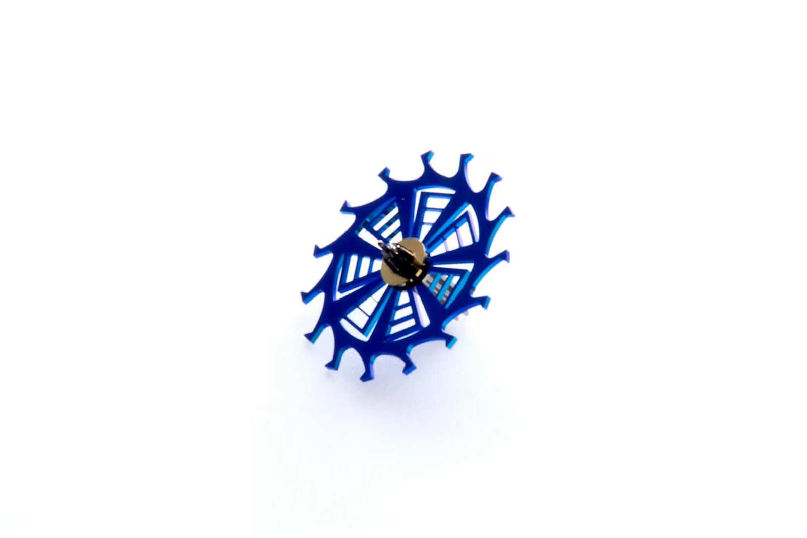 Once cut from the wafer and inspected, the escape wheel must be mounted onto its axle. Typically, metal escape wheels are press-fit or riveted into place, which is problematic when it comes to comparatively brittle silicon parts. Rather than gluing the escape wheel into place, which is the most common Swiss solution, Epson engineers designed a series of flexible arms into the escape wheel that tightly hug the escape pinion.