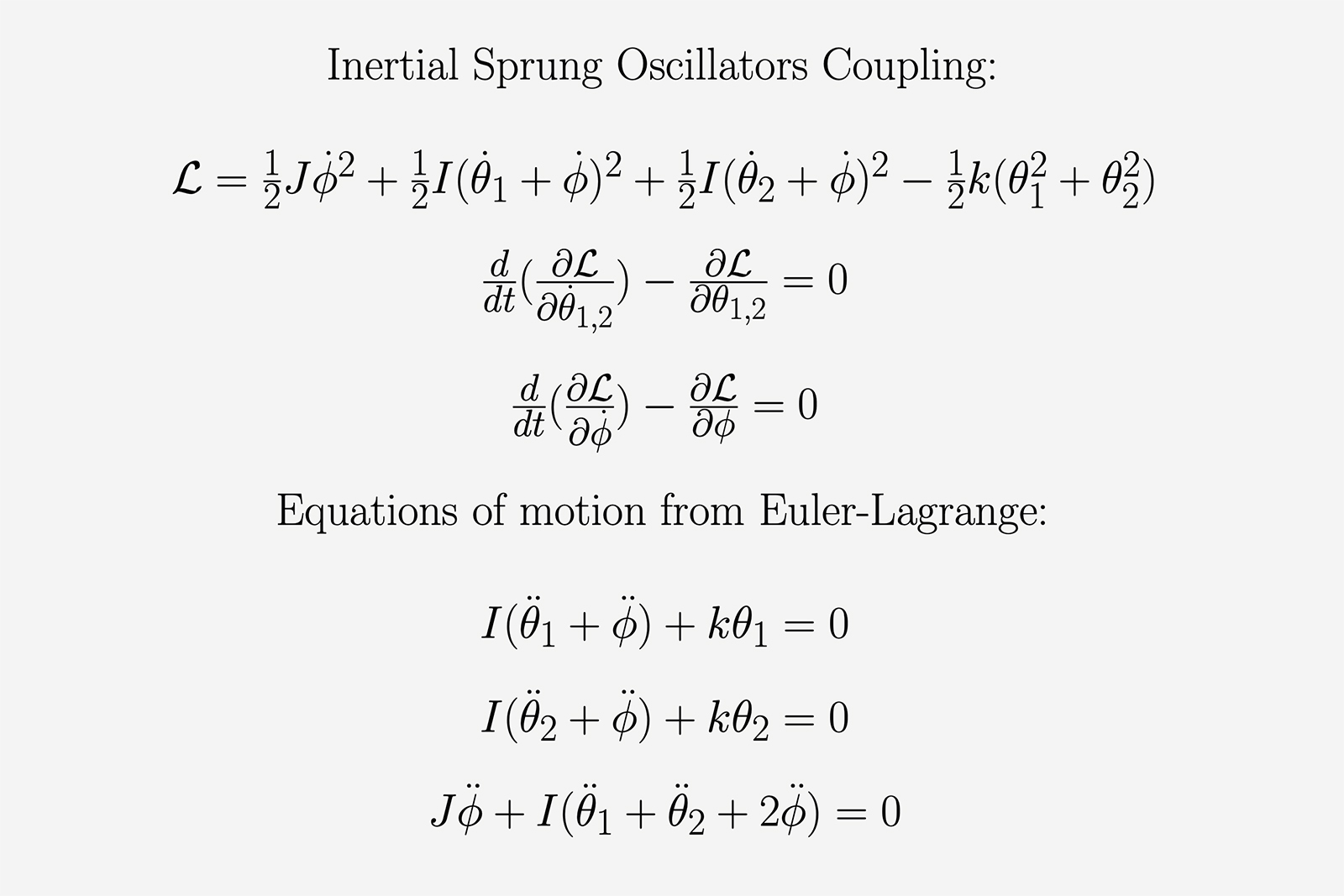Since classic Newtonian physics fails in accurately describing this particular system, we’ll use Lagrangian mechanics. This is perfect for modelling conservative systems, where energy is only transformed between states. Our model in Figure I is that of two ideal and identical sprung balances (spring angular stiffness k, balance inertia I), fixed on the same rigid frame of inertia J.