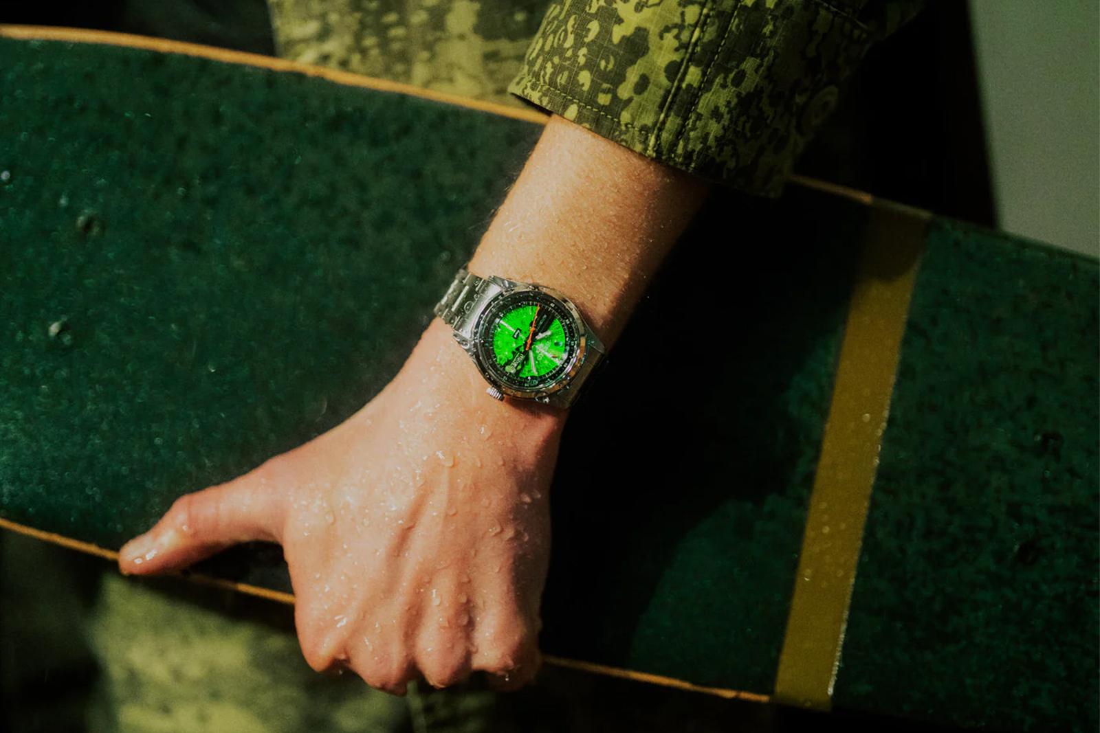Seiko and American streetwear brand HUF team up to reimagine a classic from Seiko’s back catalogue with the affordable Seiko 5 Sports HUF Limited Edition. Inspired by Seiko’s Time Sonar flyback chronographs from the 1970s, the sunburst translucent dials have been given a new look in HUF green that works particularly well with the sonar theme.