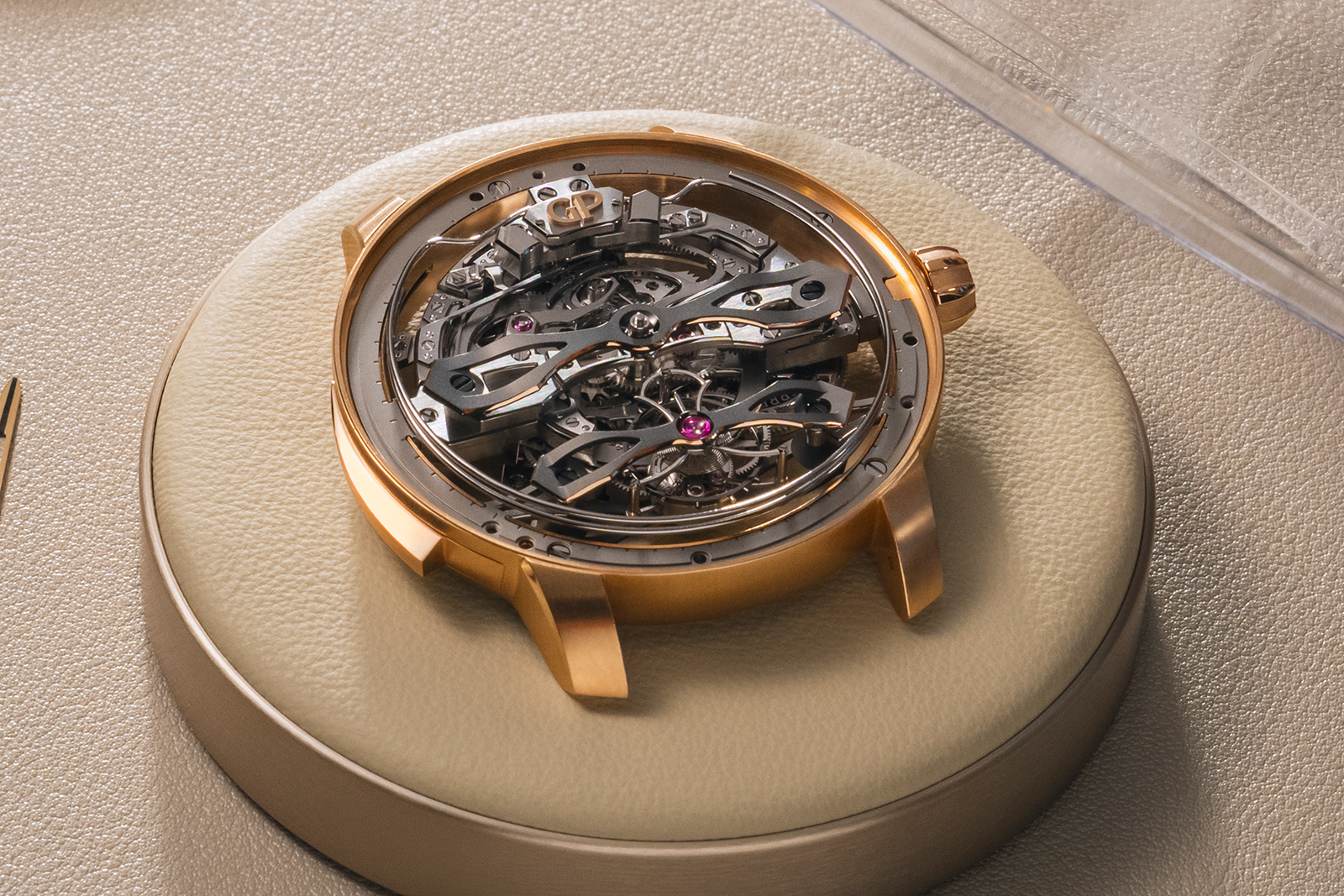 A horizontal clutch drives the sweep hour counter, where slight stuttering during engagement is essentially a non-issue. Then an oscillating pinion pinion drives the minutes counter and a vertical clutch – or “absolute clutch” as De Bethune calls it – drives the seconds hand.