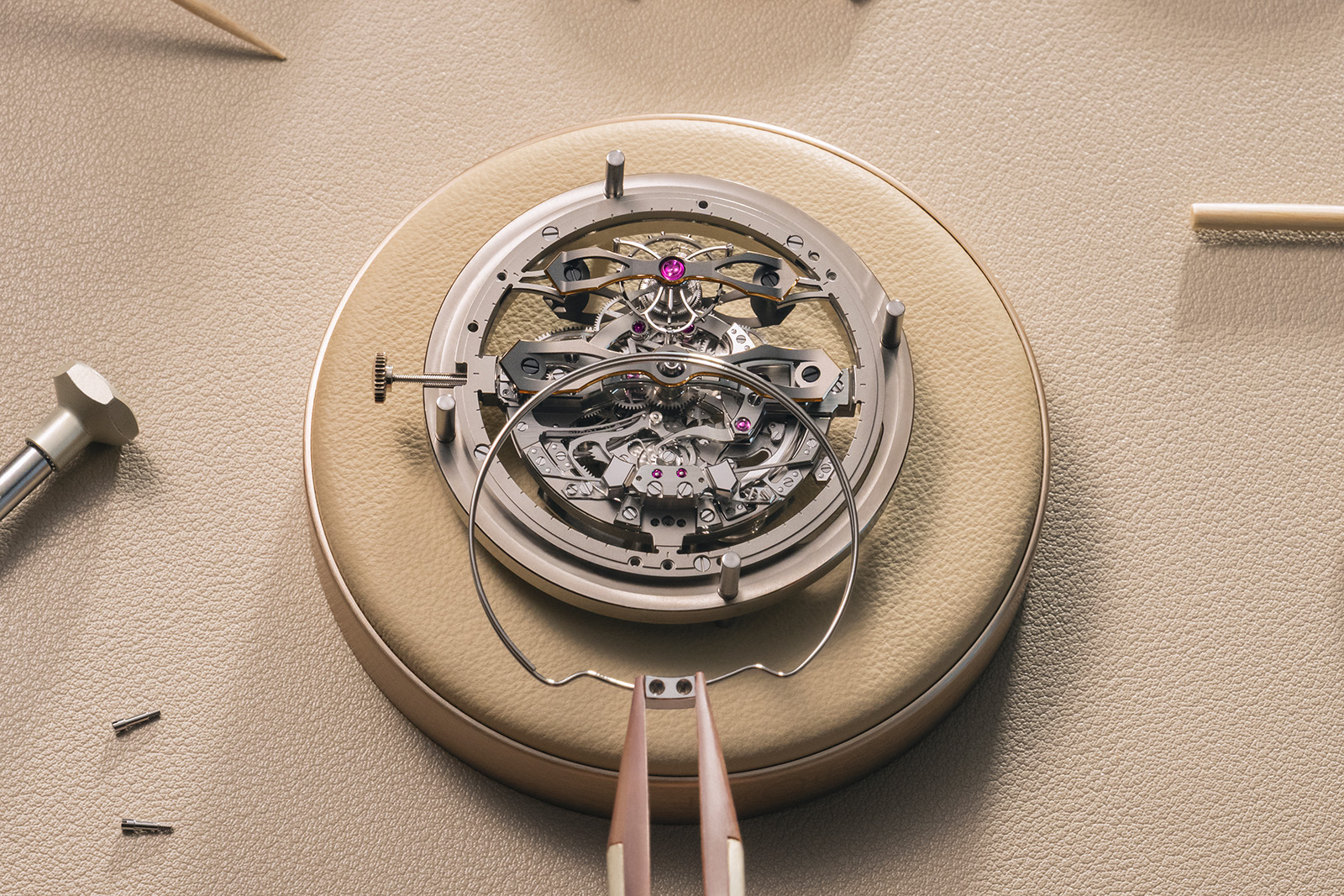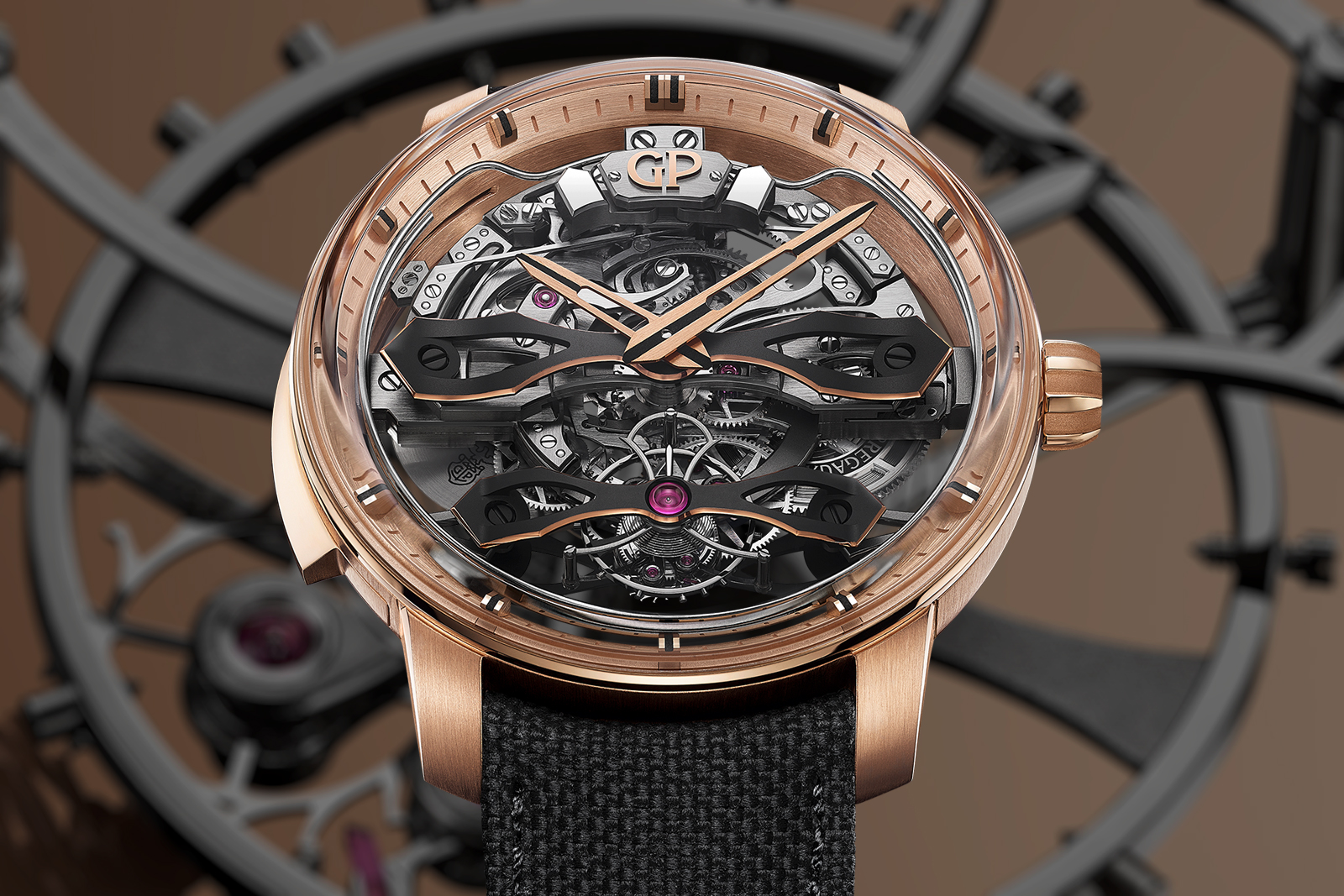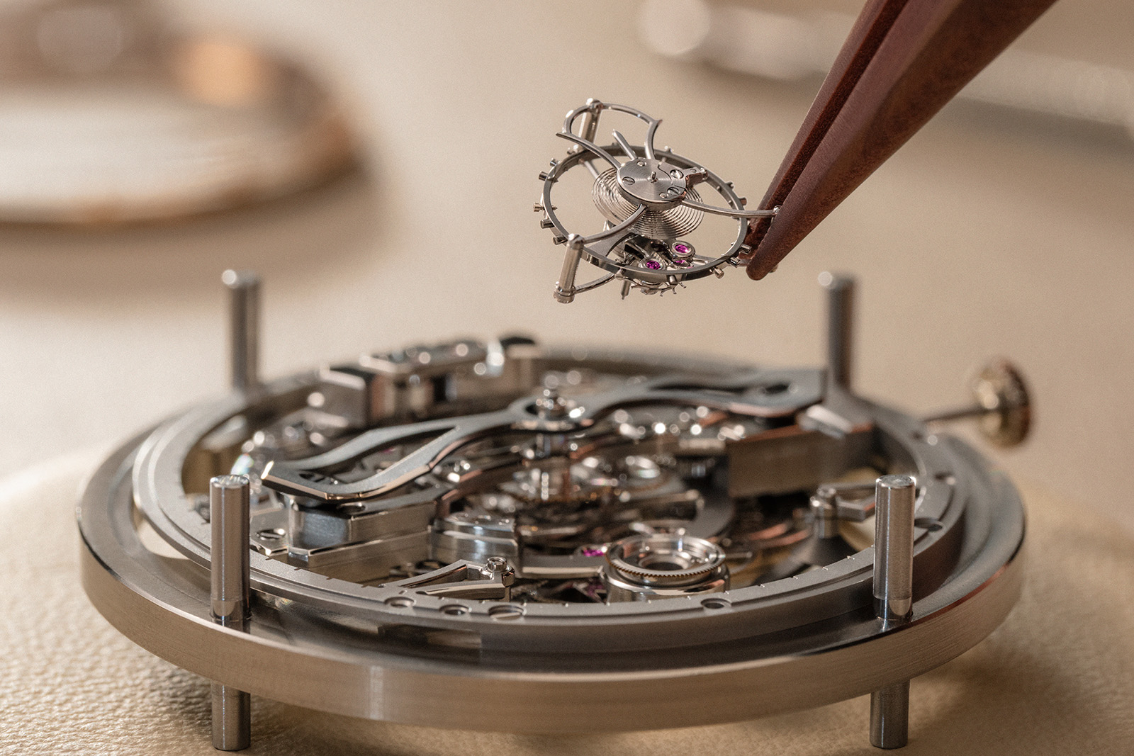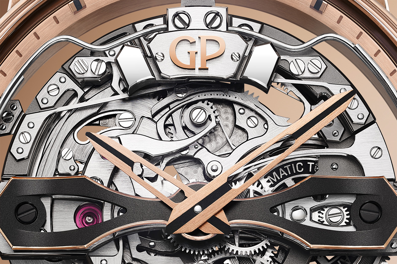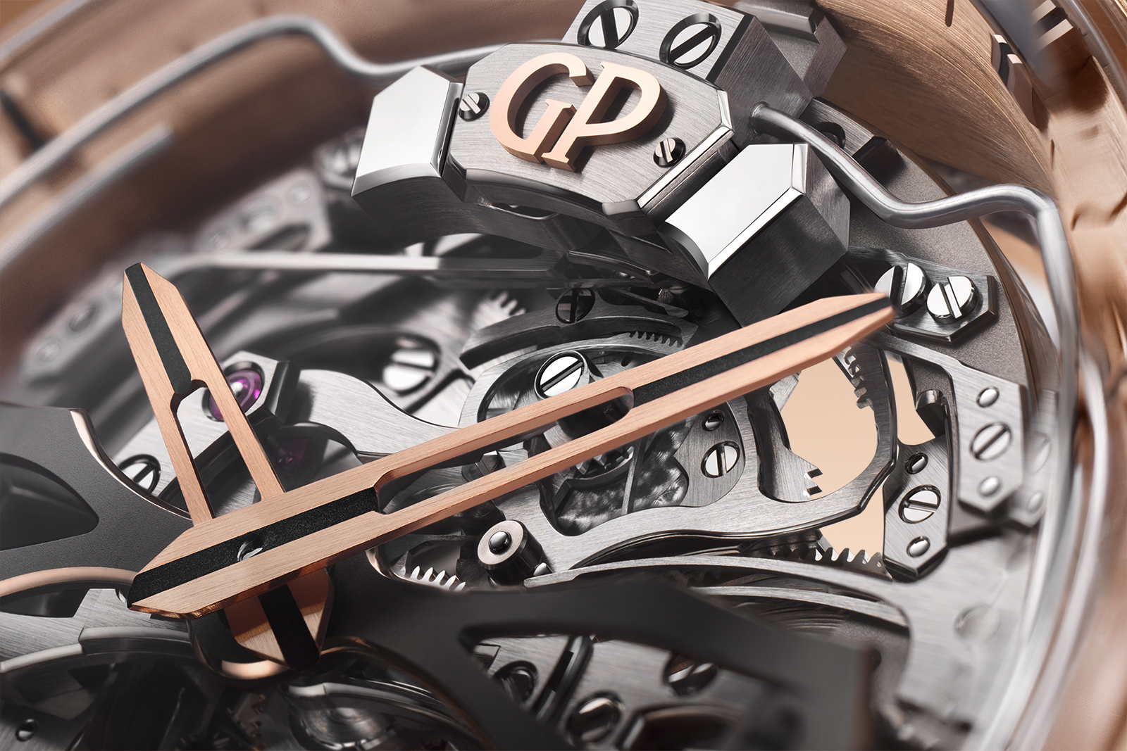 Those familiar with GP’s catalogue might recognise the strikework. That’s because the repeating mechanism is based on that found in the GP09500, a manual-wind repeater-tourbillon movement conceived with the help of MHC that debuted in 2015.