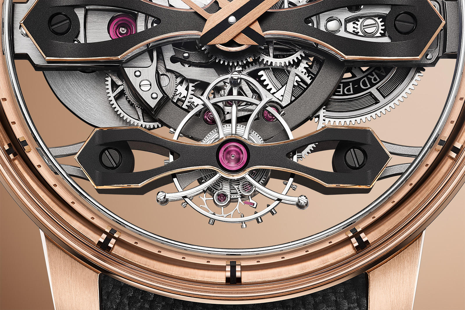 The arched, three-dimensional bridges are indeed made from solid pink gold, but black-coated on their top surfaces to create contrast with the polished gold anglage. Known as “Neo Bridges”, these are GP’s modern take of its classic design. Given the nature of this particular piece, the historical arrow-shaped bridges might have worked better, but the modern “Neo” versions don’t disappoint either.