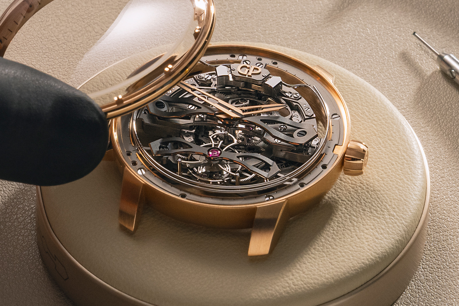 In terms of finishing, GP didn’t hold back. There are about 1,340 chamfers in total, including some 295 interior angles, which help explain why finishing and assembly takes more than 440 hours, or approximately 11 weeks of full-time work. All assembly and finishing is done by a single watchmaker, who then engraves their signature on a small plate and affixes it to the movement.