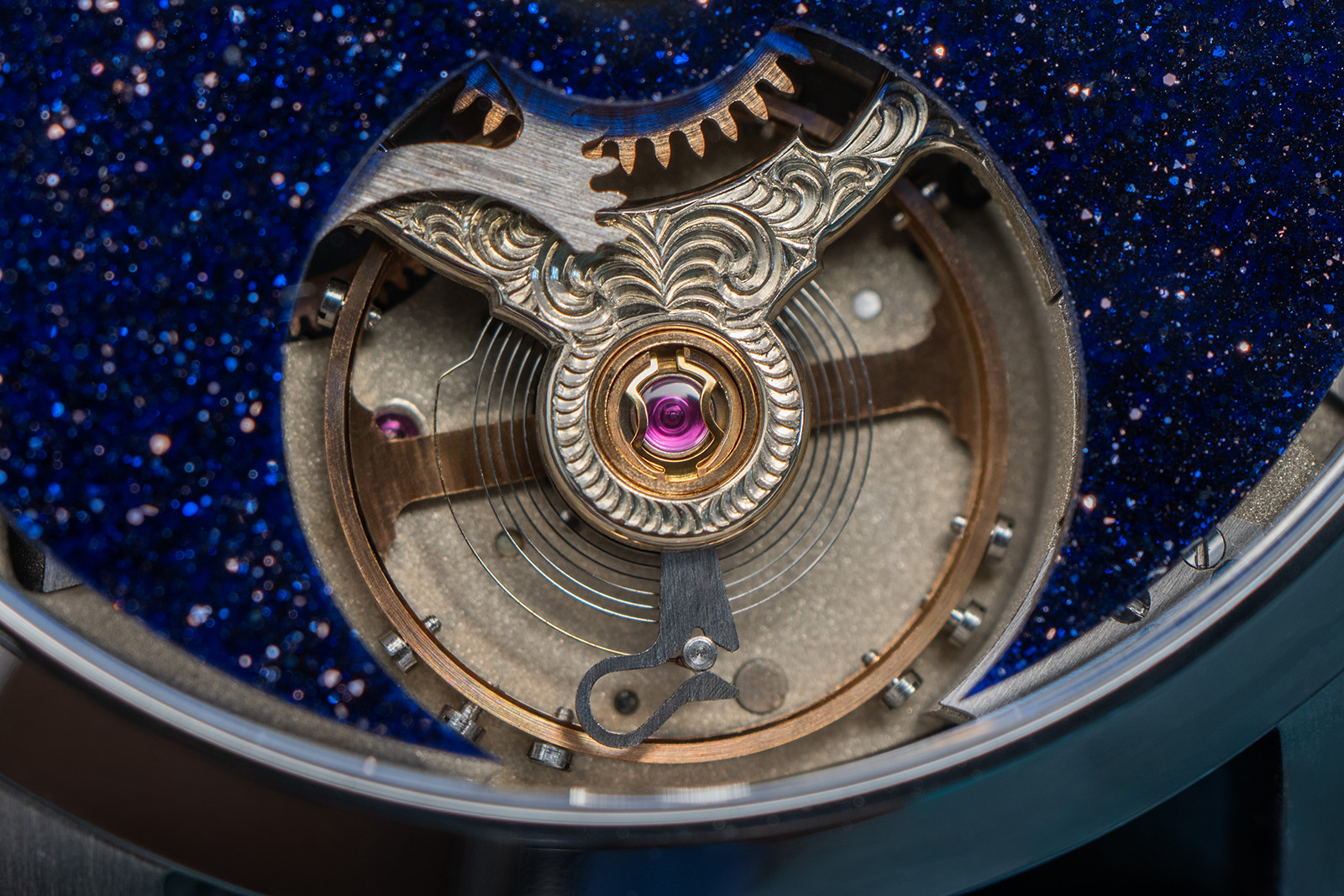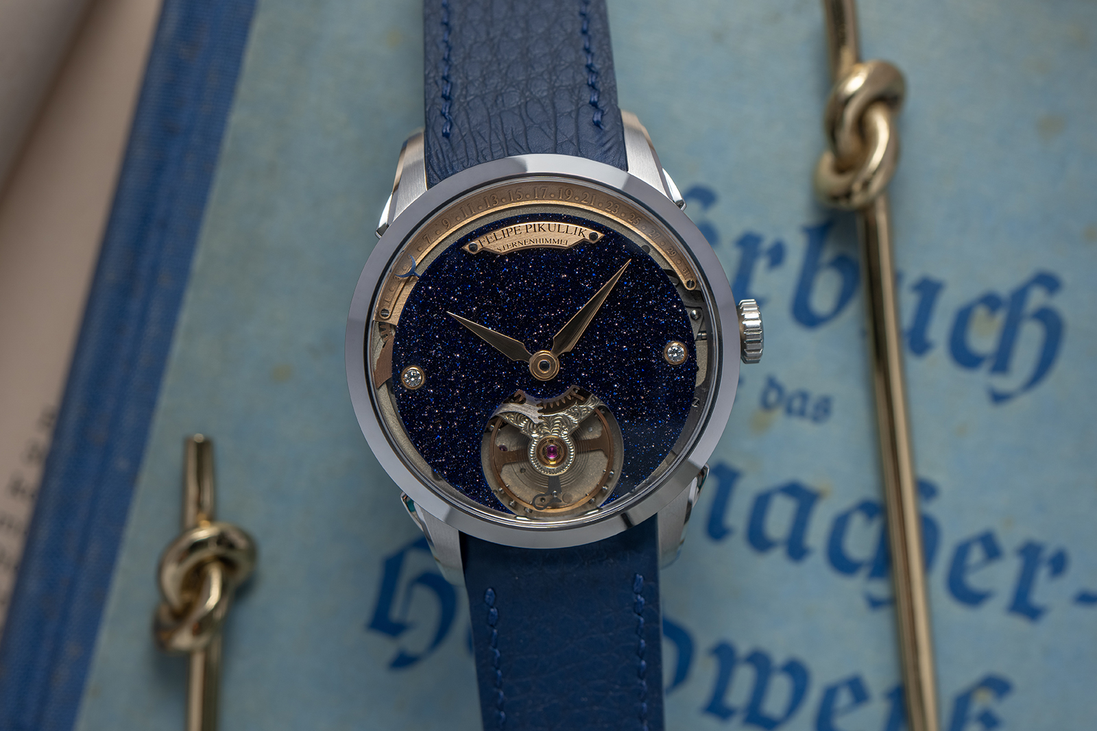 This specific iteration of the Sternenhimmel design is decidedly more modern and technically-oriented, with a floating dial that reveals glimpses of movement visible around the edges. The aventurine dial evoking a starry night sky has long been a Felipe Pikullik leitmotif.
