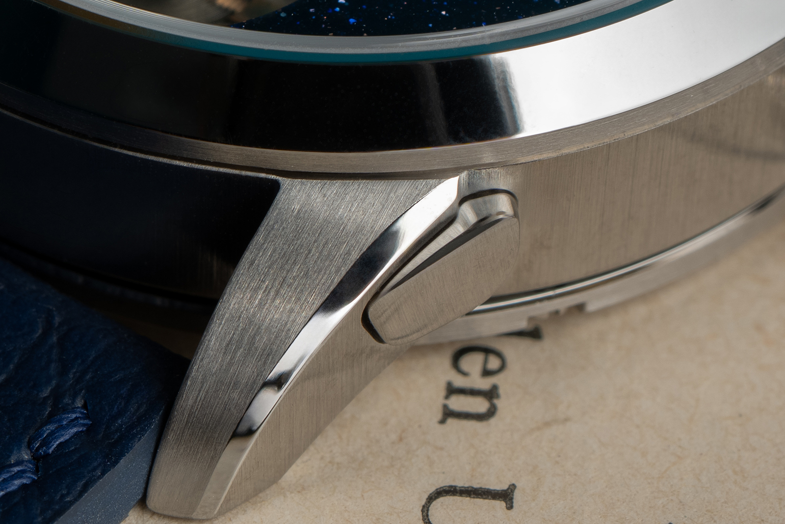 The Sternenhimmel is, from any angle, a quintessentially classical timepiece: the case measures a proper 39 mm, features Pikullik’s angular lugs, and carries a sparkling aventurine glass dial complemented by two jewel-like settings for the three and nine o’clock markers.