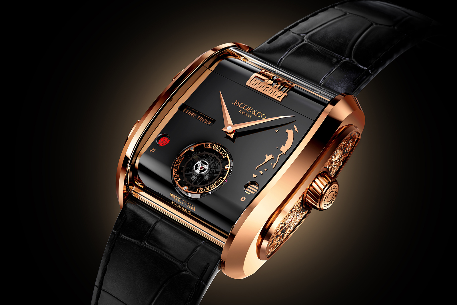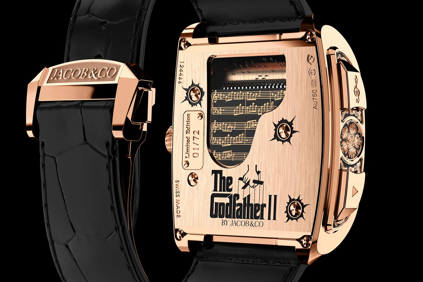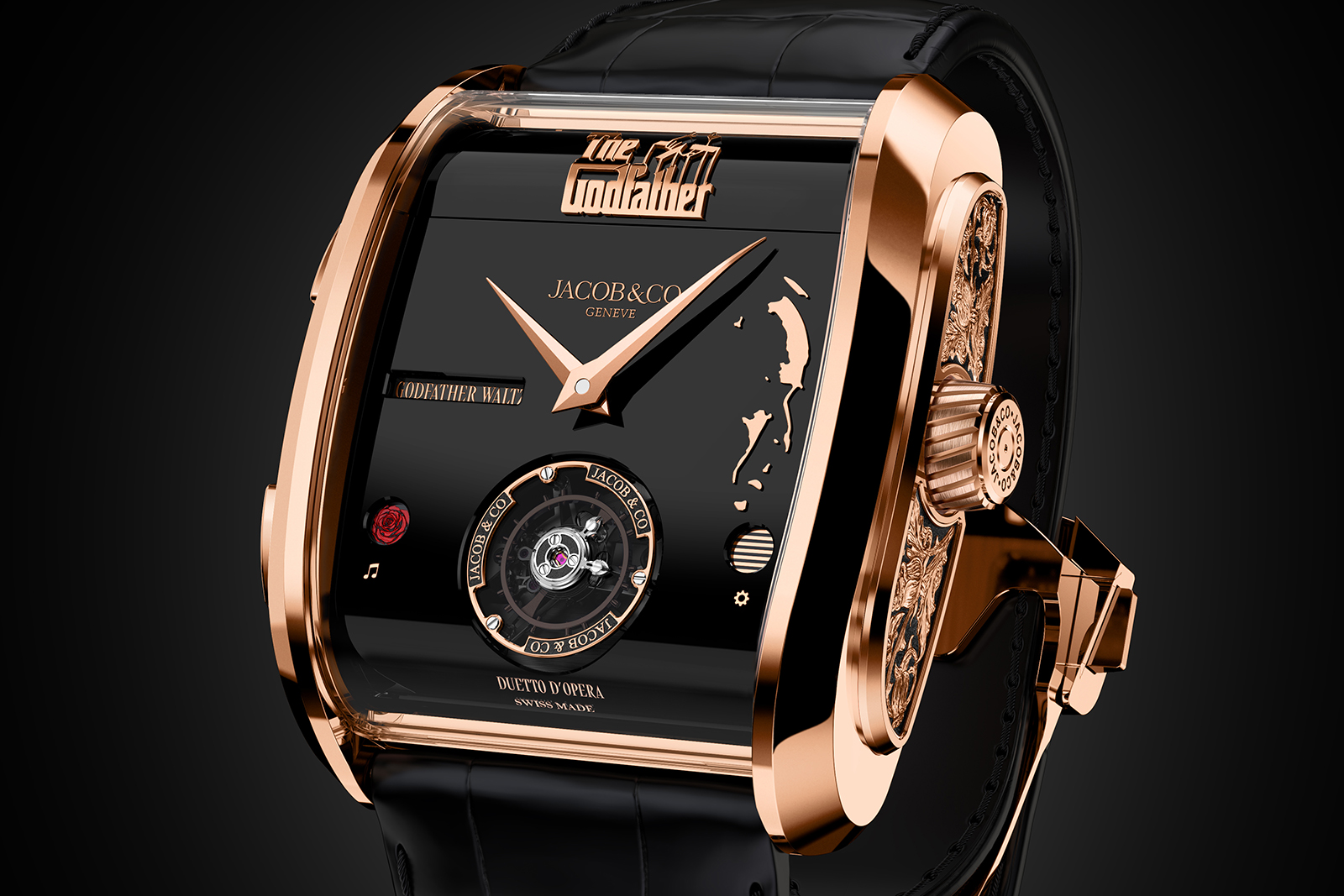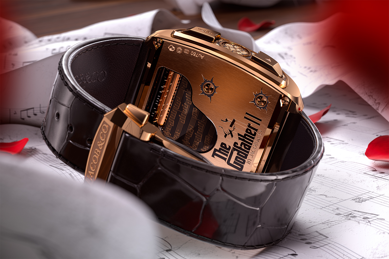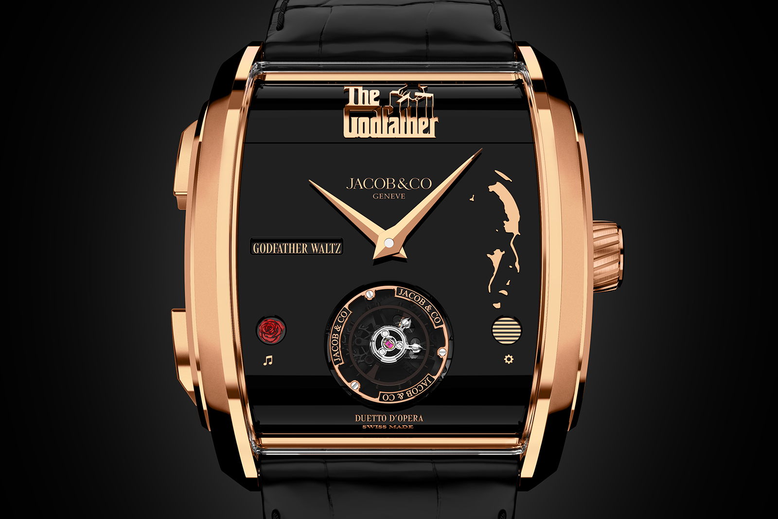 With this second model inspired by Mr Coppola’s saga, Jacob & Co. doubled down on the music box feature, adding a second tune that can be played in addition to the iconic theme. The second melody is the Godfather Waltz and the wearer can chose between either melody at the push of a button.