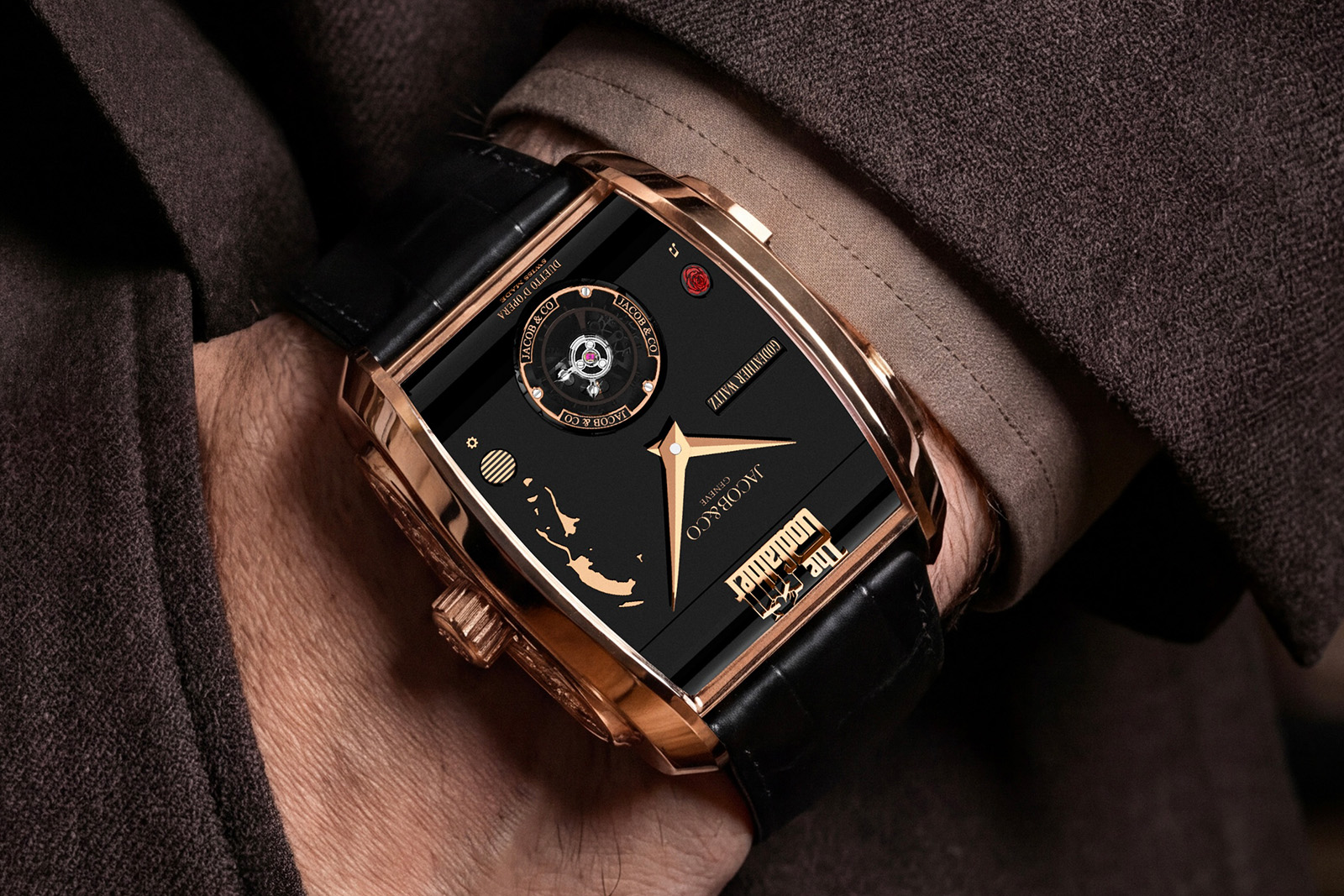 As is typical of Jacob & Co., the dial is integrated with the movement. The black lacquer surface carries two functional power reserve apertures and a portrait of Don Corleone, with the brand signature and the franchise’s puppet string logo — raised and detailed — on the retractable shroud for the cylinder.