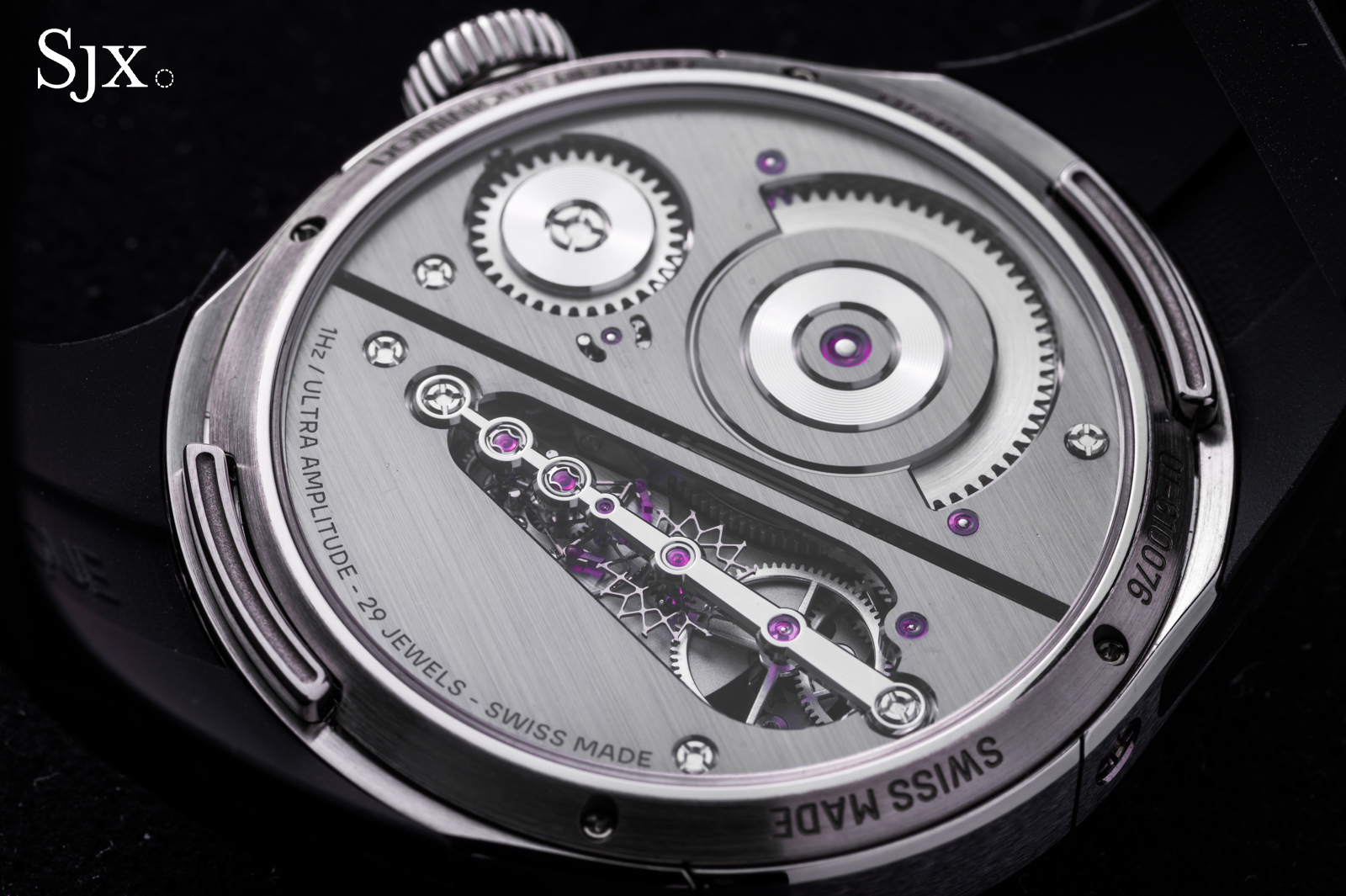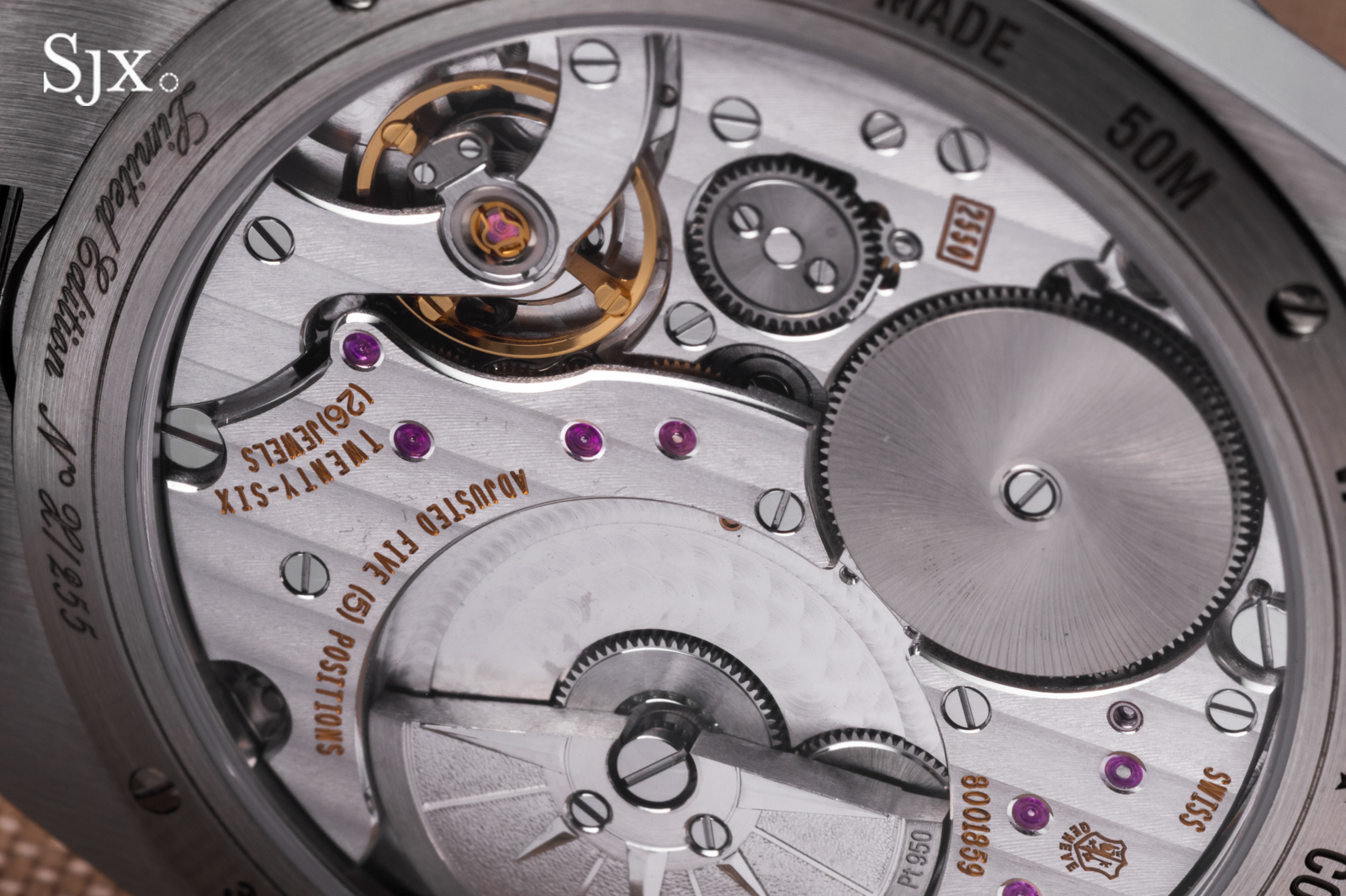 Both rotors are mounted in ceramic ball bearing races, though only the cal. 2550 winds in both directions. This implies greater efficiency, though the topic remains disputed and depends on numerous factors. As a point of reference, F.P. Journe is an example of a brand that has abandoned bidirectional winding in favour of unidirectional winding for the sake of winding efficiency.
