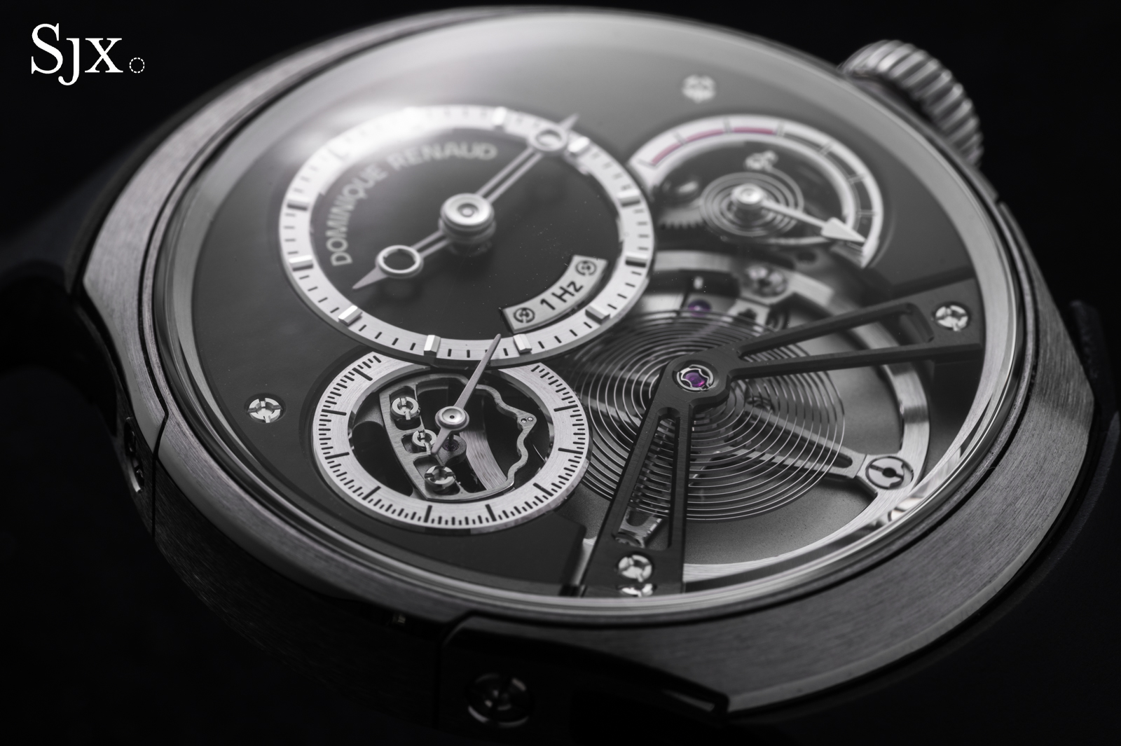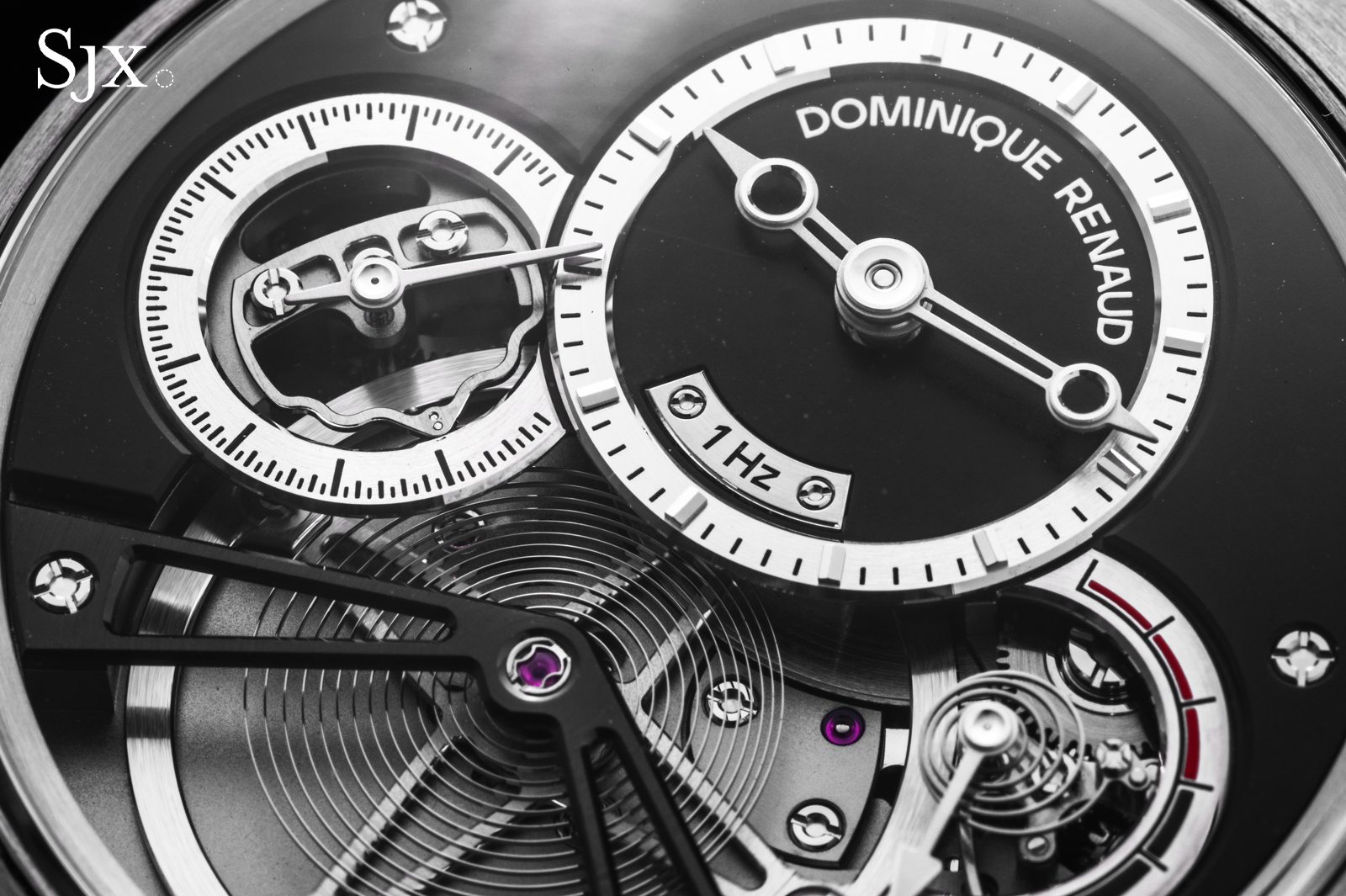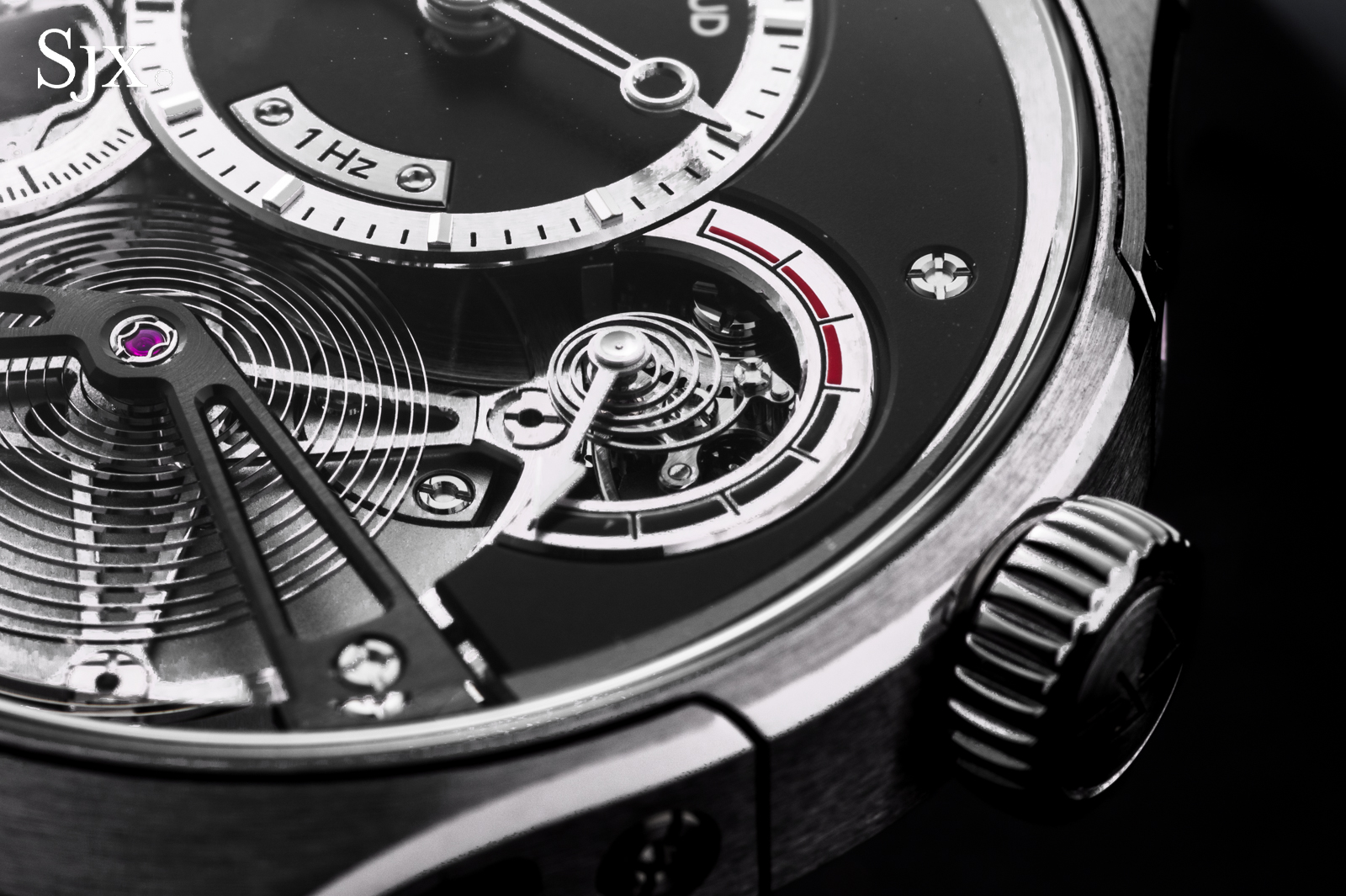 The oscillators in both movements are free-sprung, with flat hairsprings mounted to Geneva-style stud carriers. Each is adjusted with two pairs of inertia blocks, and the regulating organs could hardly be more well-matched.