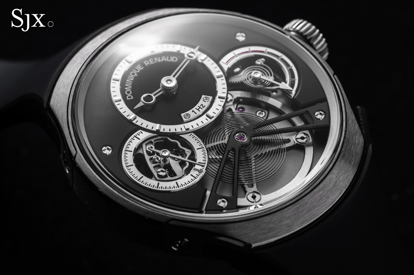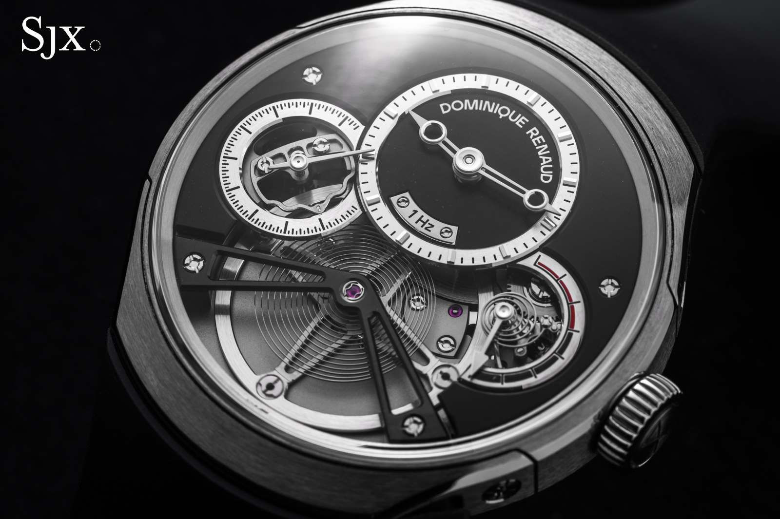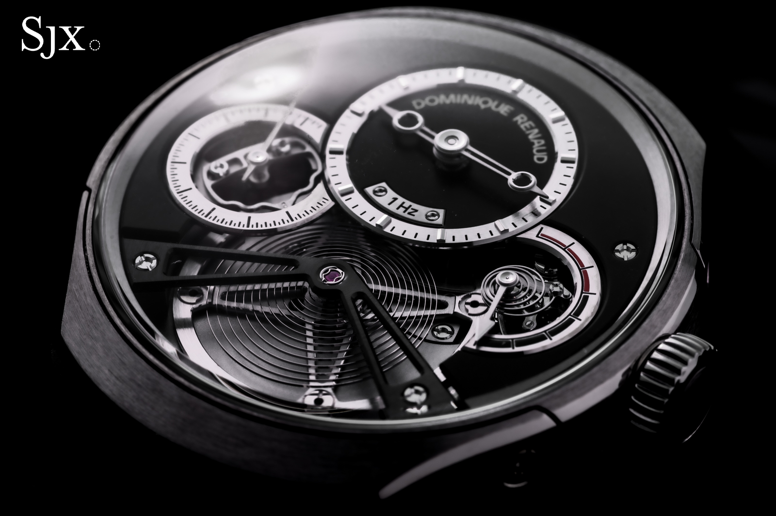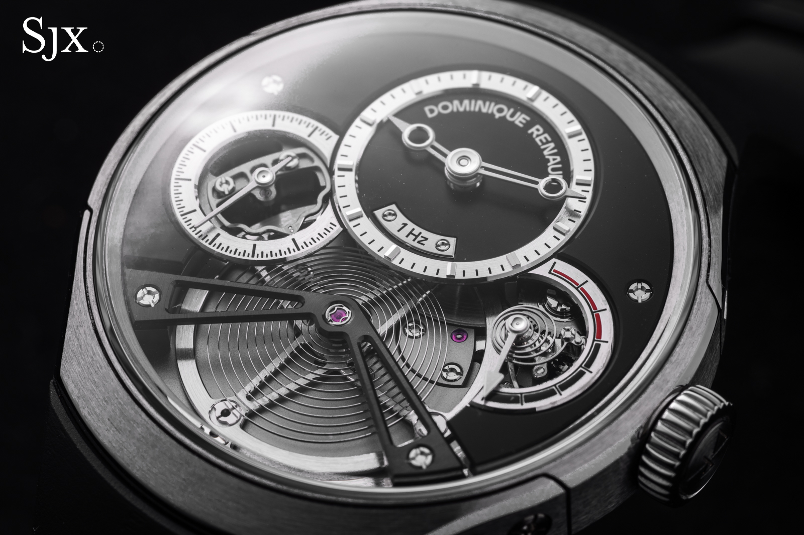The oscillators in both movements are free-sprung, with flat hairsprings mounted to Geneva-style stud carriers. Each is adjusted with two pairs of inertia blocks, and the regulating organs could hardly be more well-matched.