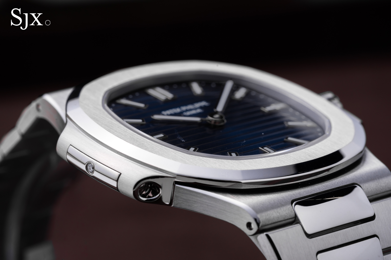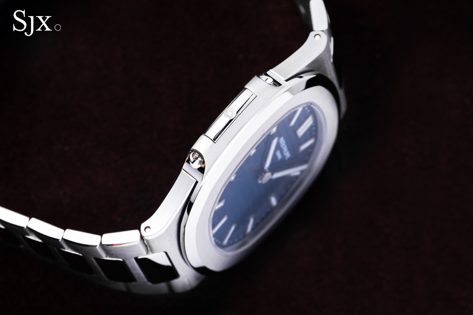 Like all platinum watches from Patek Philippe, the Nautilus ref. 5610P denotes the material with a discreet diamond, in this case placed at nine o’clock.
