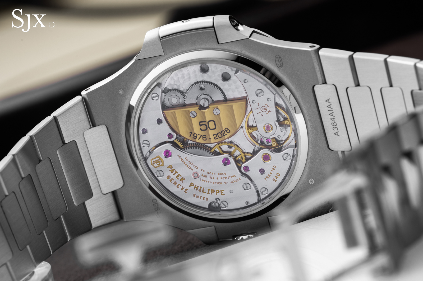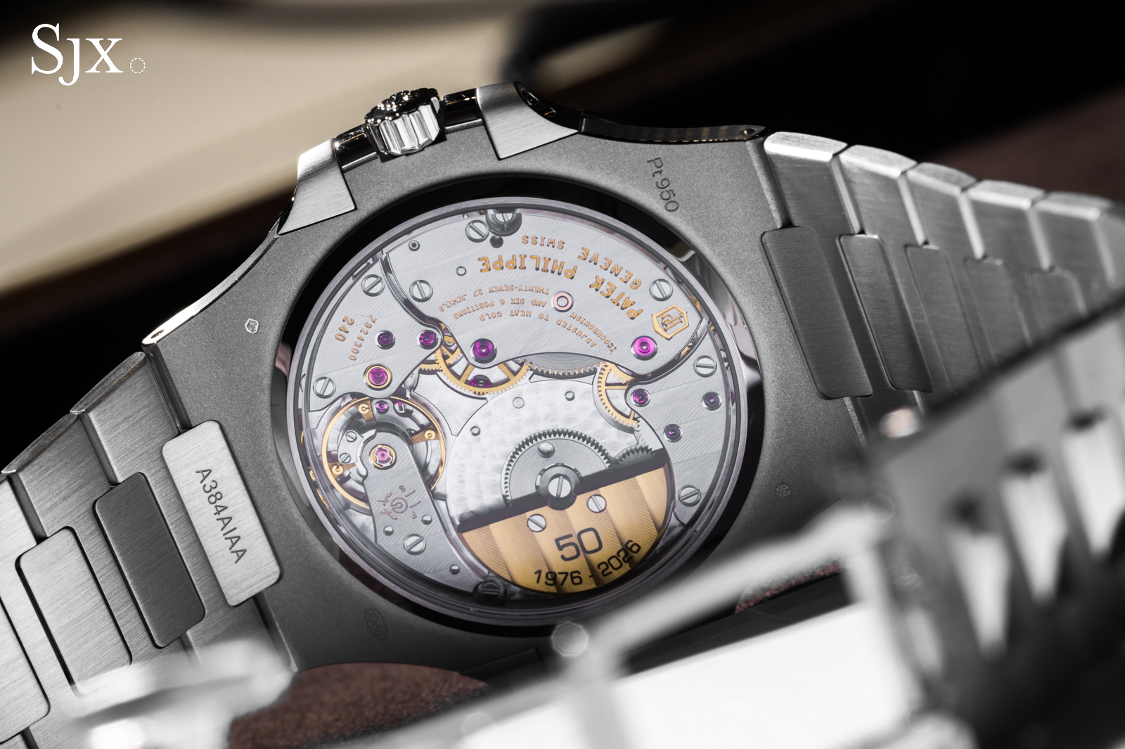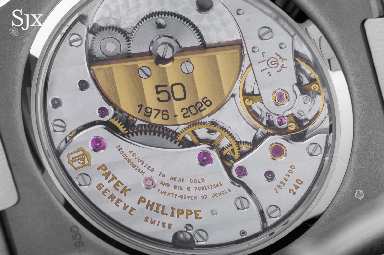 If I could change one thing about the 50th anniversary treatment applied to the cal. 240, it would be the overly simple choice of font for the engraving on the rotor. In the brand’s marketing materials, Patek Philippe uses a stylised ‘0’ in the ’50’ shaped like the Nautilus case — such a detail would have elevated the anniversary engraving.