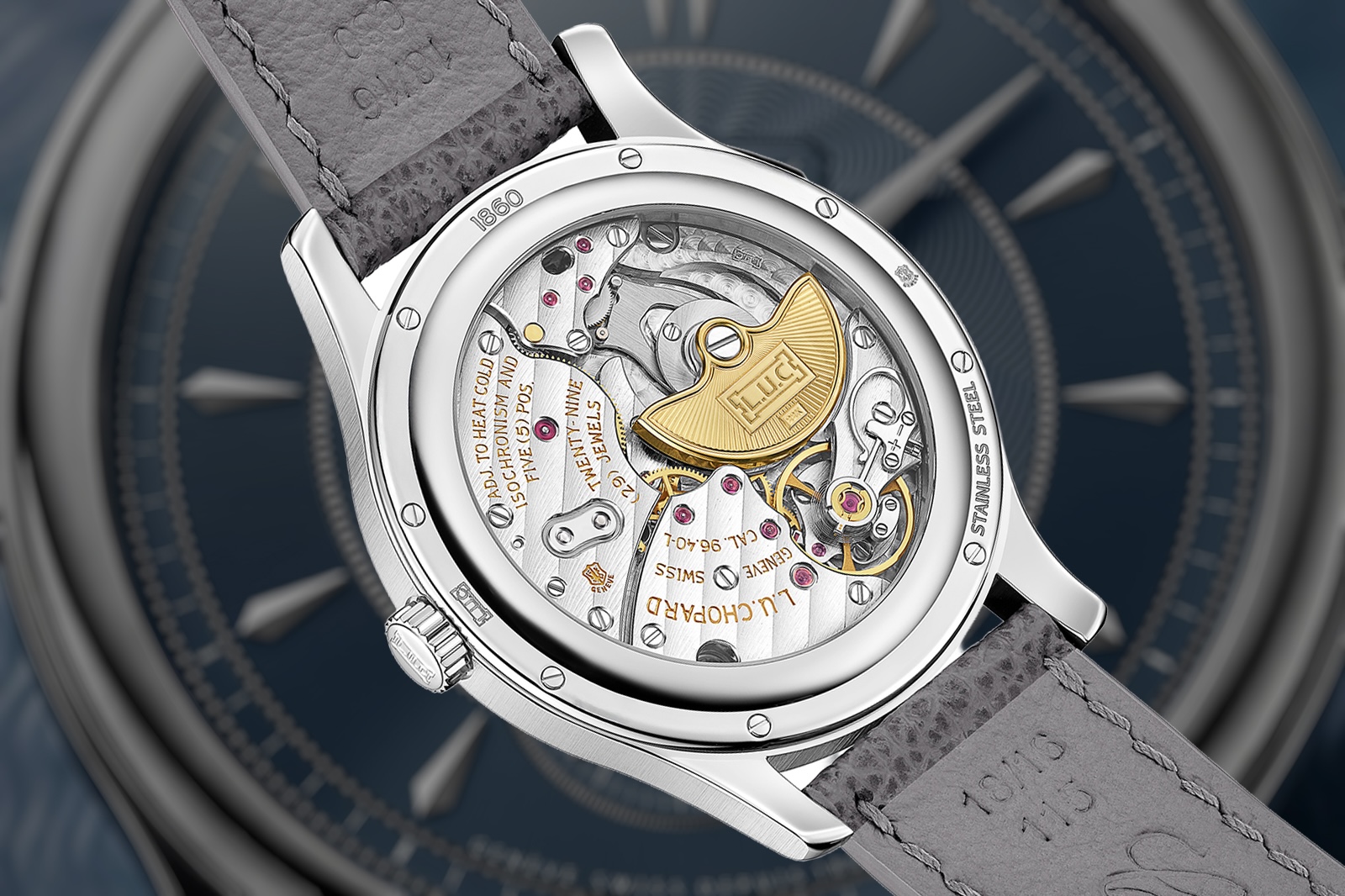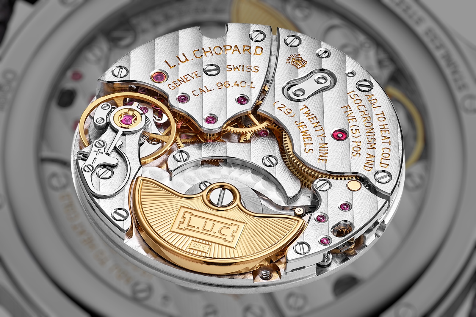 The cal. 96.40-L is an evolution of the cal. 1.96 that put Chopard on the map as a serious watchmaker in the late 1990s. Designed by Michel Parmigiani, the cal. 1.96 had dual mainspring barrels and an overcoil hairspring — features that were unheard of in a micro-rotor format — and expert finishing that put other Genevan watchmakers on notice.