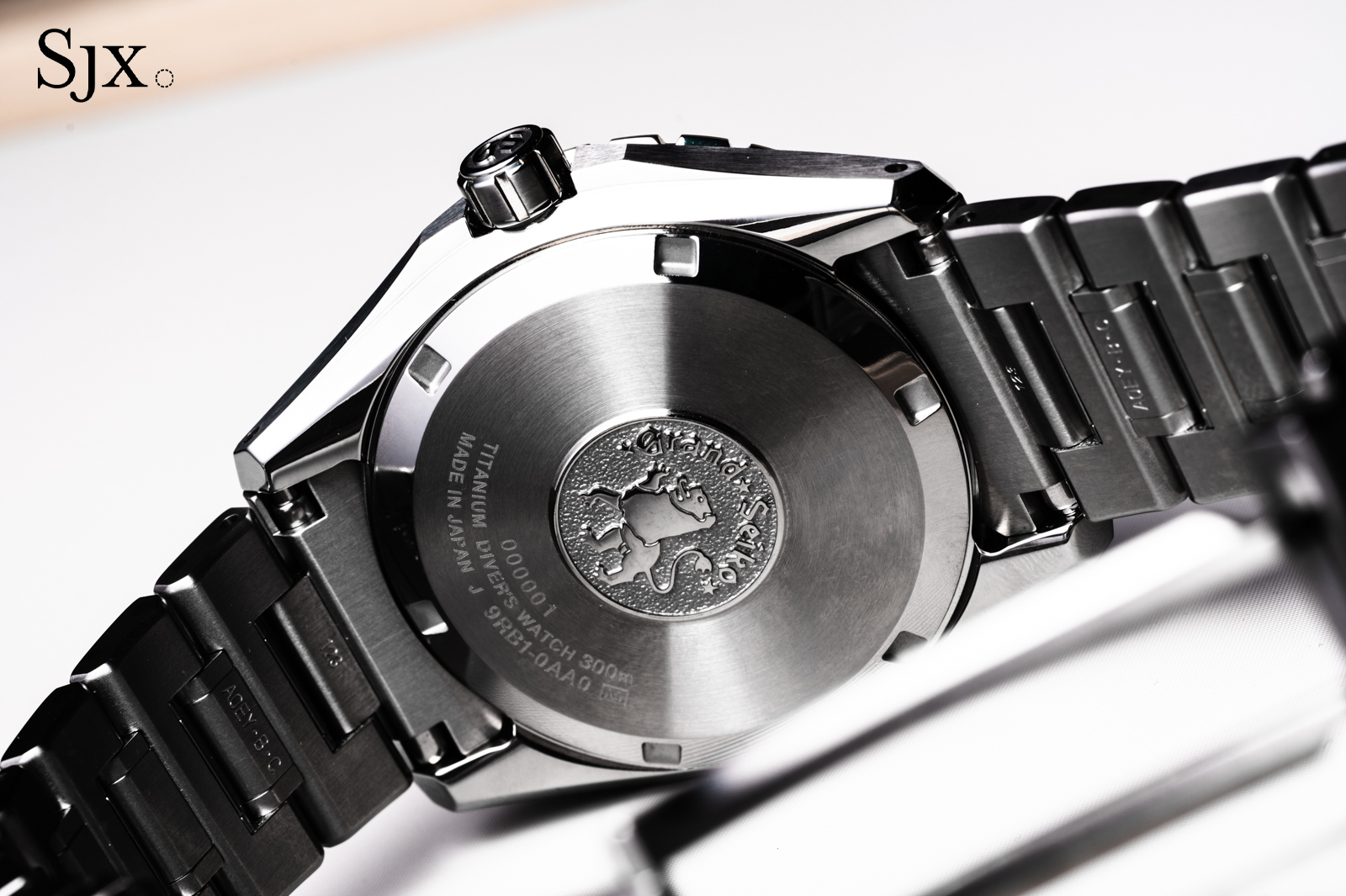 Display case backs are increasingly common on luxury dive watches, but not for Grand Seiko. Also note the thick, extra-strength spring bars common to Seiko dive watches.