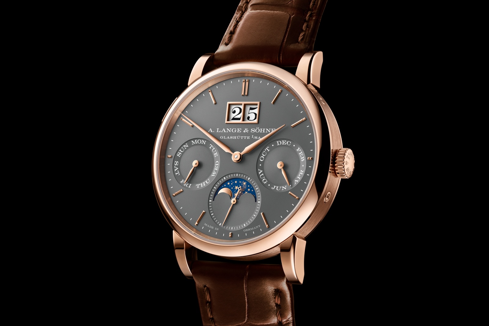 The sunken sub-dials for the day and month are offset below the centre line of the dial to avoiding crowding the big date at 12 o’clock, and are decorated with concentric snailing, giving the dial plenty of depth — an especially satisfying characteristic in a thin watch. The typical Lange hands are solid gold, as are the applied dial markers, which exhibit a new pyramid-like shape at the perimeter.