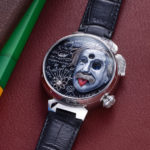 The Arty Automata features a dial with seven animations, including the stars, heart, eyeball, and cloud. This kick into gear when the pusher at eight o’clock is depressed. Time, in contrast, is relegated to a small register at three o’clock. The hour and minute hands can get lost in the riot of colours on the dial, which is probably the point.