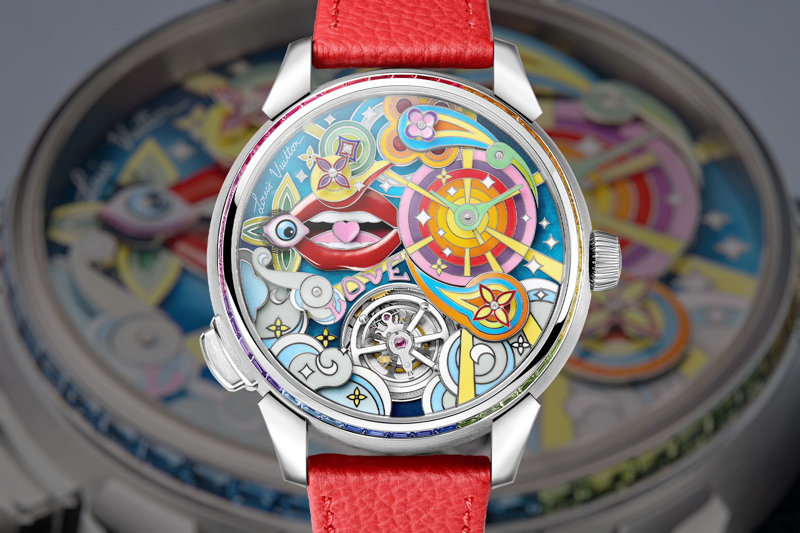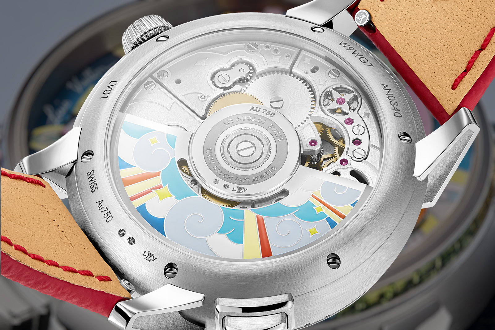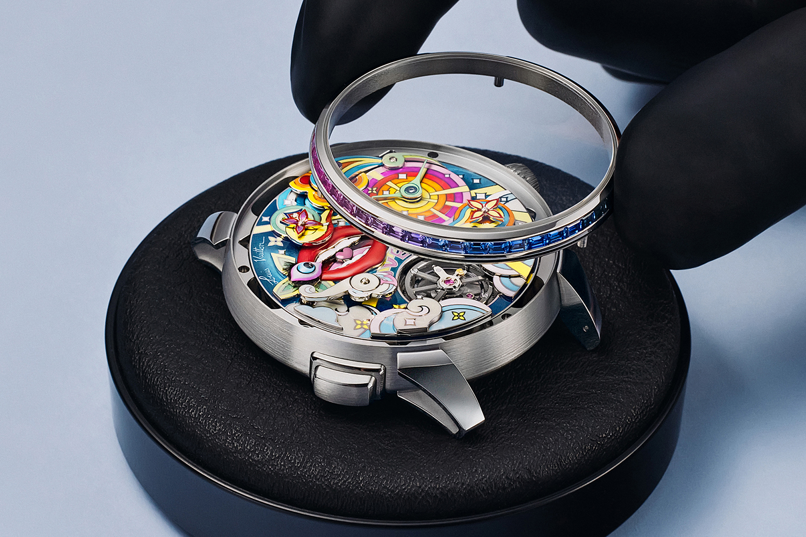 The Tambour Taiko Arty Automata is the latest creation from Louis Vuitton to feature jacquemart, or mechanical animations. Like the Tambour Opera before it, the Arty Automata features a complex, multi-layer dial with multiple mechanisms that whir into motion at the press of a button, including spinning hearts and a swivelling eyeball. But this also incorporates a flying tourbillon at six, while the dial itself is grand feu enamel – and tiny bird feathers for the eyelashes.