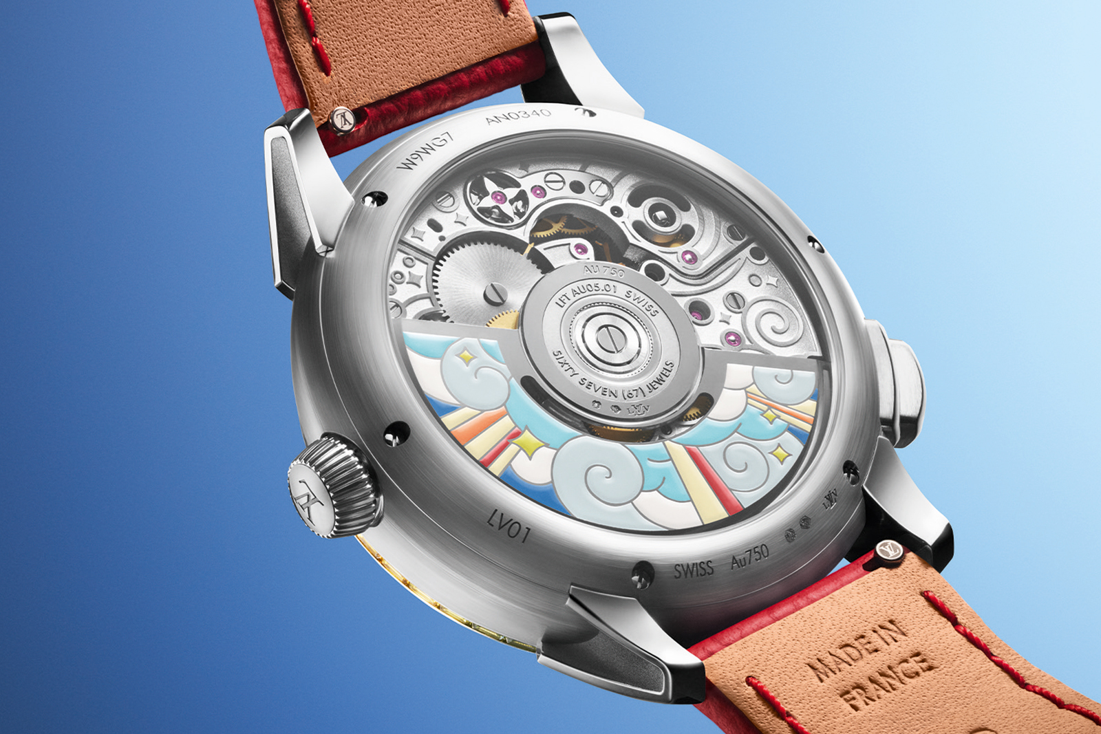The attention to detail in terms of the movement also shows in its aesthetics: the calibre adopts the house style of LFT with its relief bridges, but adopted to the “Arty” aesthetic with stars, clouds, and a lacquered rotor. That said, the Etachron-type regulator index for the balance is definitely out of place in a watch of this price.