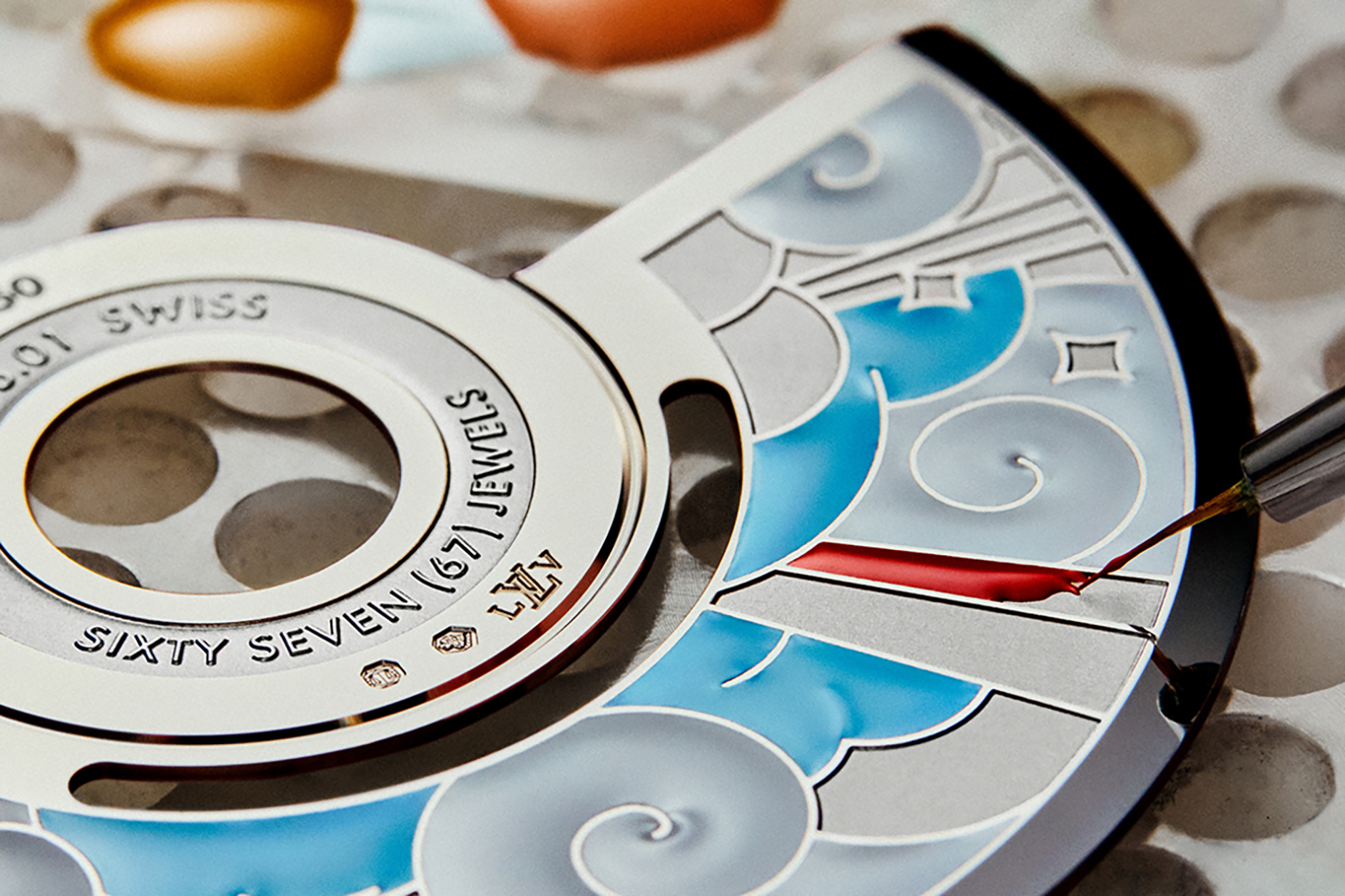 The dial itself is made up of 20 parts, all enamelled by hand with techniques including champleve and miniature painting. A total of 23 shades of enamel were employed for the dial, which requires over 250 hours of work by an enameller.