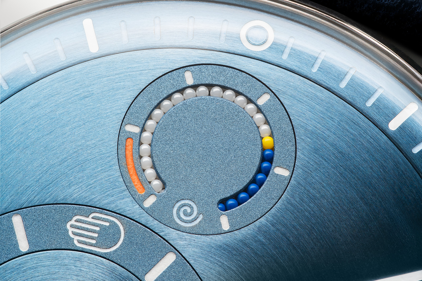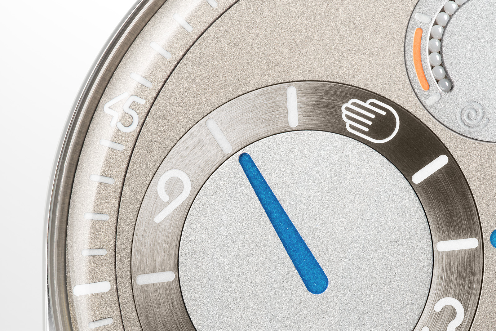 When the watch is fully wound, only the bright marbles are on show. As the power runs down, the ratio changes in favour of the dark-hued balls. When the power reserve gets critically low, the darker marbles will reach an orange sector, encouraging the wearer to wind the watch.