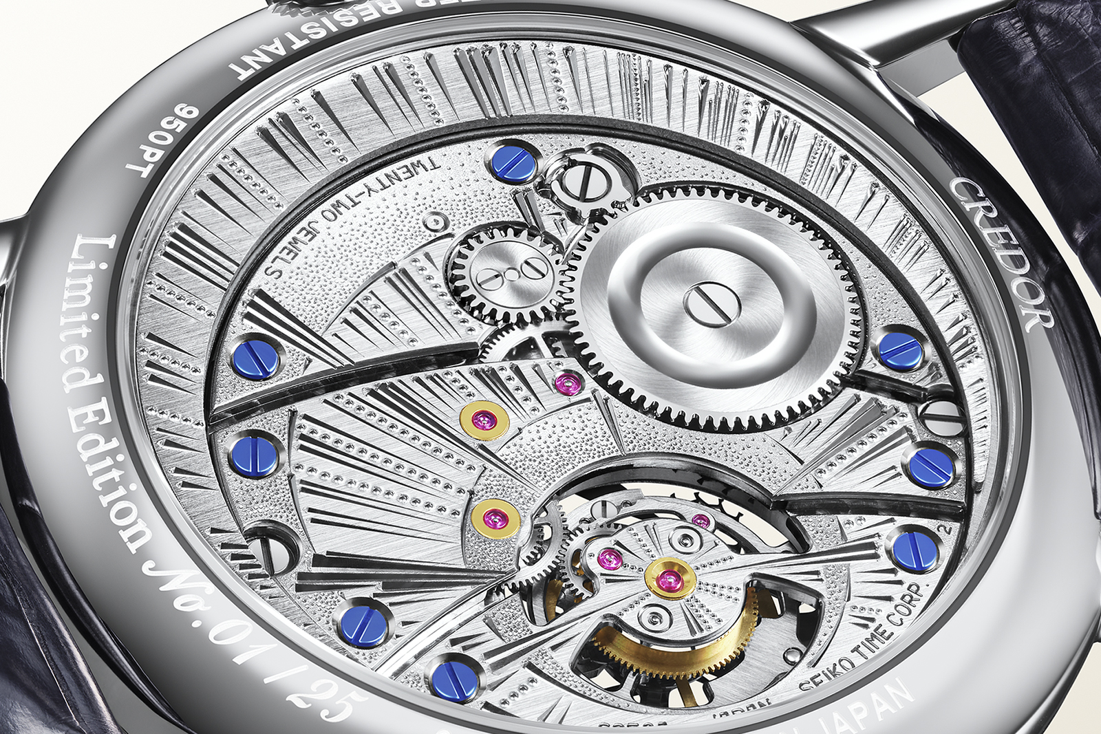 As with Credor’s other extra-thin watches, engraving the bridges is especially challenging due to the slimness of the parts, which are as thin as 0.25 mm. The bridges are set in a specially designed vice and then engraved to ensure flatness is preserved; even the slightest distortion of the bridge will result in a misaligned pivot.
