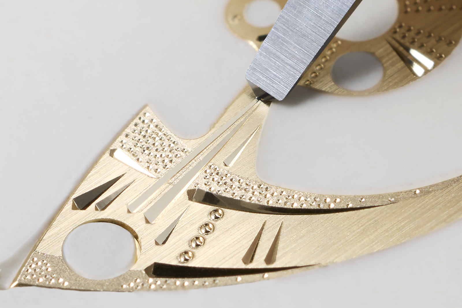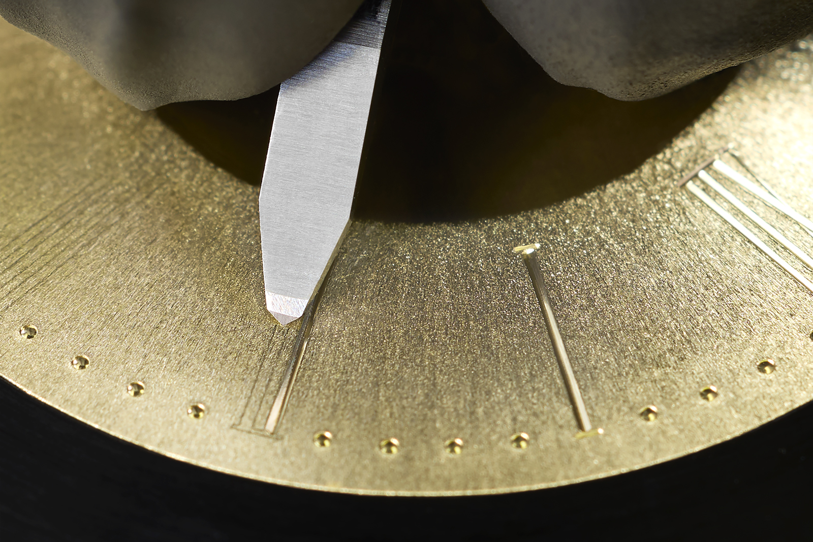 The lack of colour belies the complexity of the dial decoration. The entire dial is engraved, right down to the radial graining. Instead of conventional brushing, the radial pattern is achieved with a manual engraving technique.